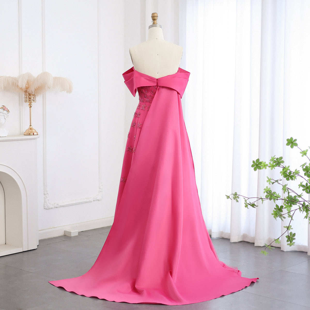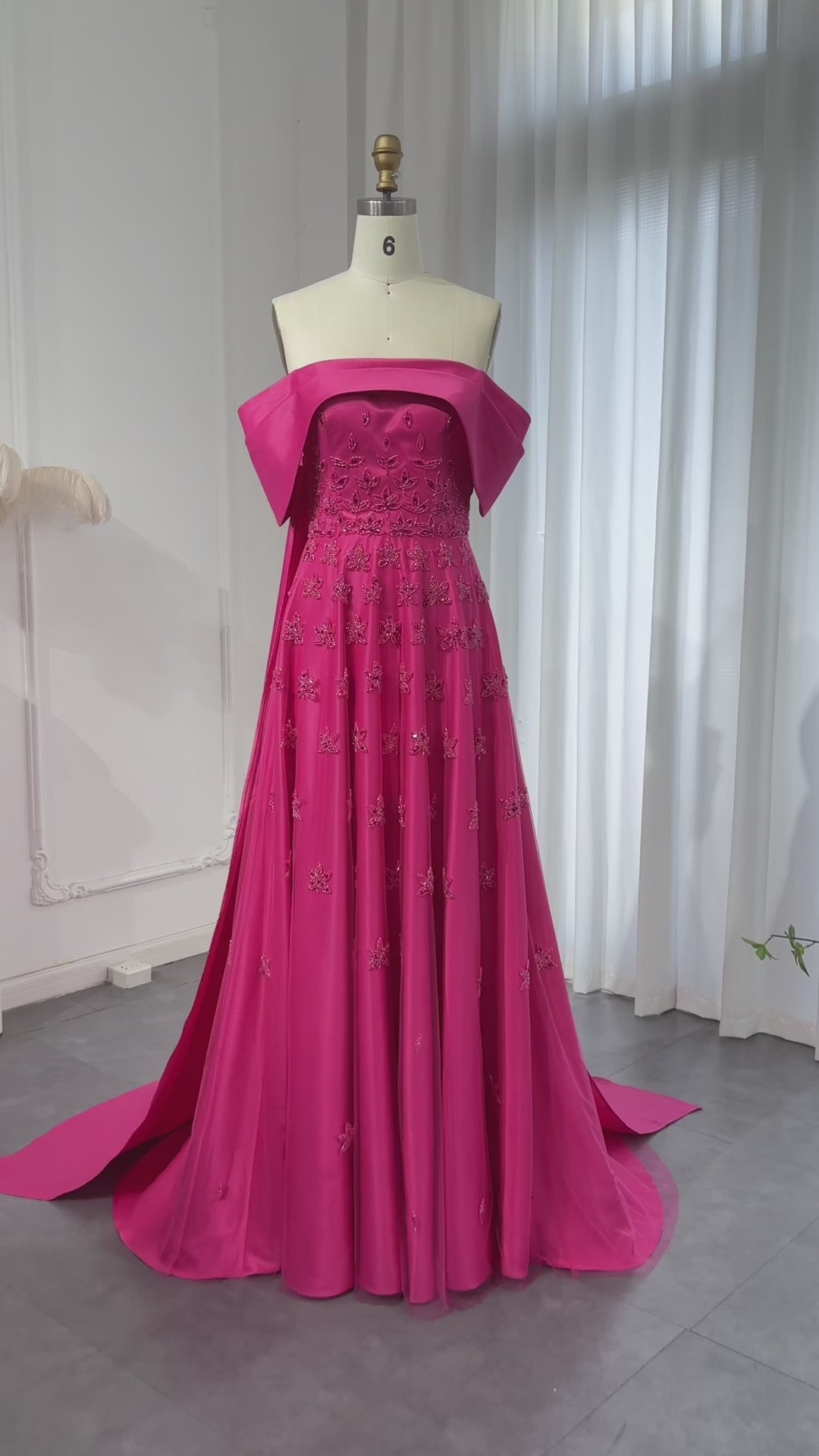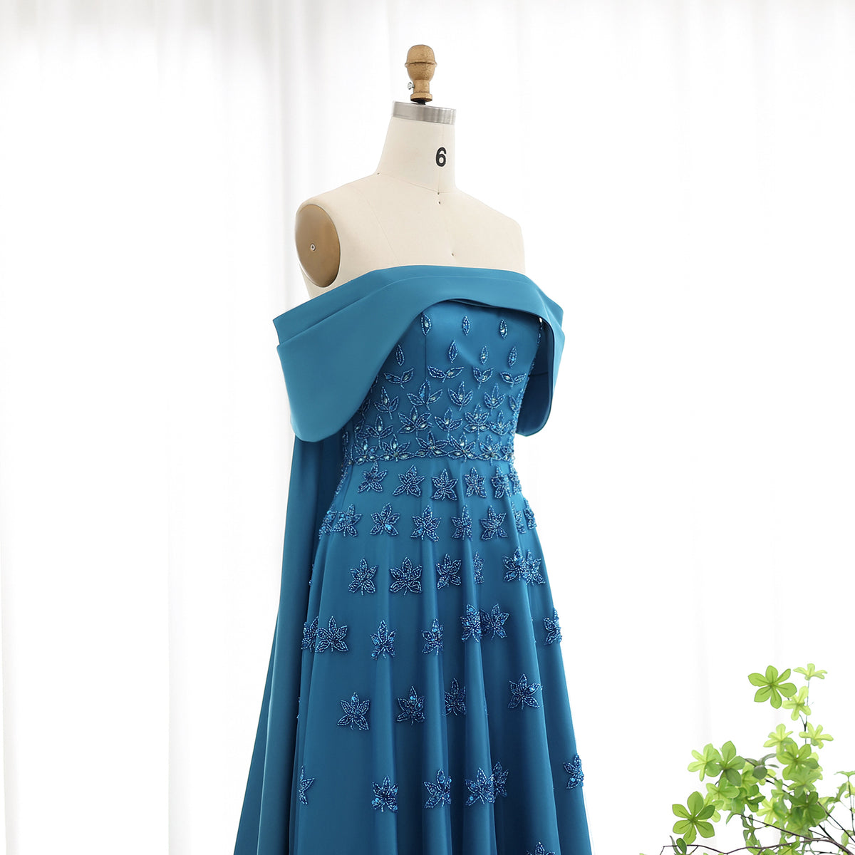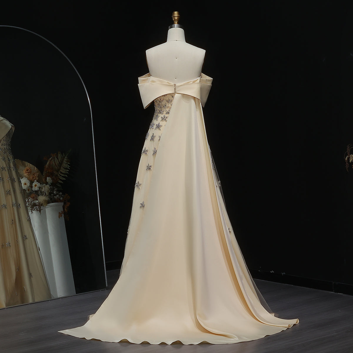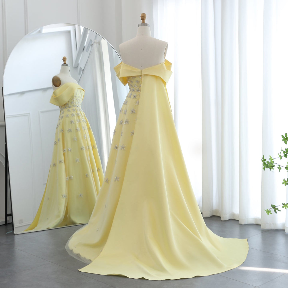 Experience the ultimate in luxury with the Sharon Said Arabic Yellow Satin Evening Dress. The elegant off shoulder design is enhanced by a stunning cape train, adding a touch of drama to any occasion. Perfect for weddings, parties, or any special event, this dress is a guaranteed head-turner.
