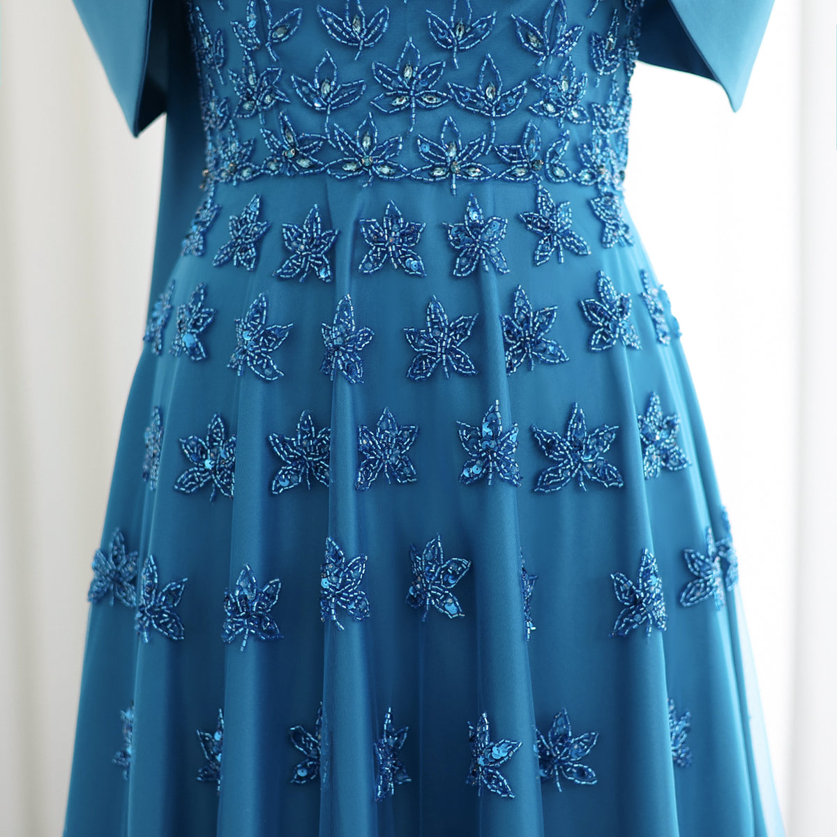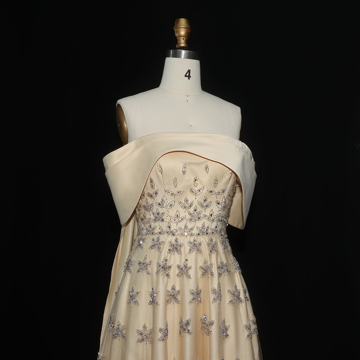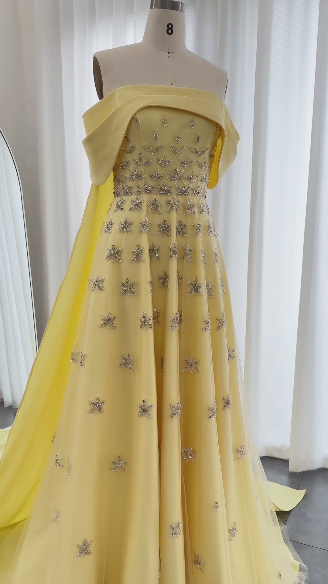 Elegant Beaded Yellow Satin Evening Dress with Cape SS455