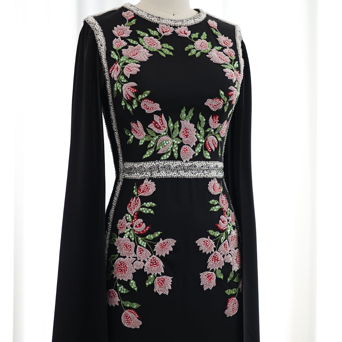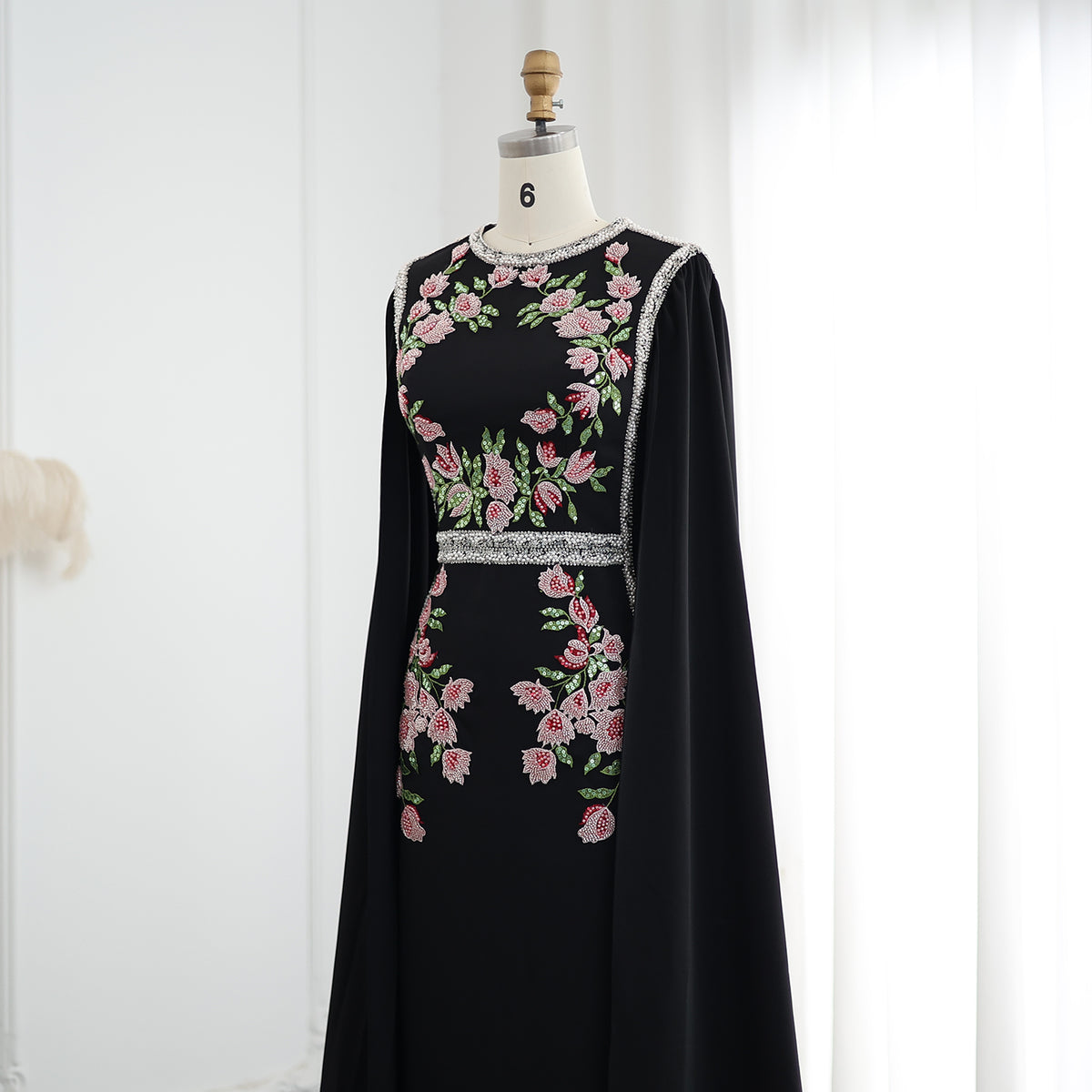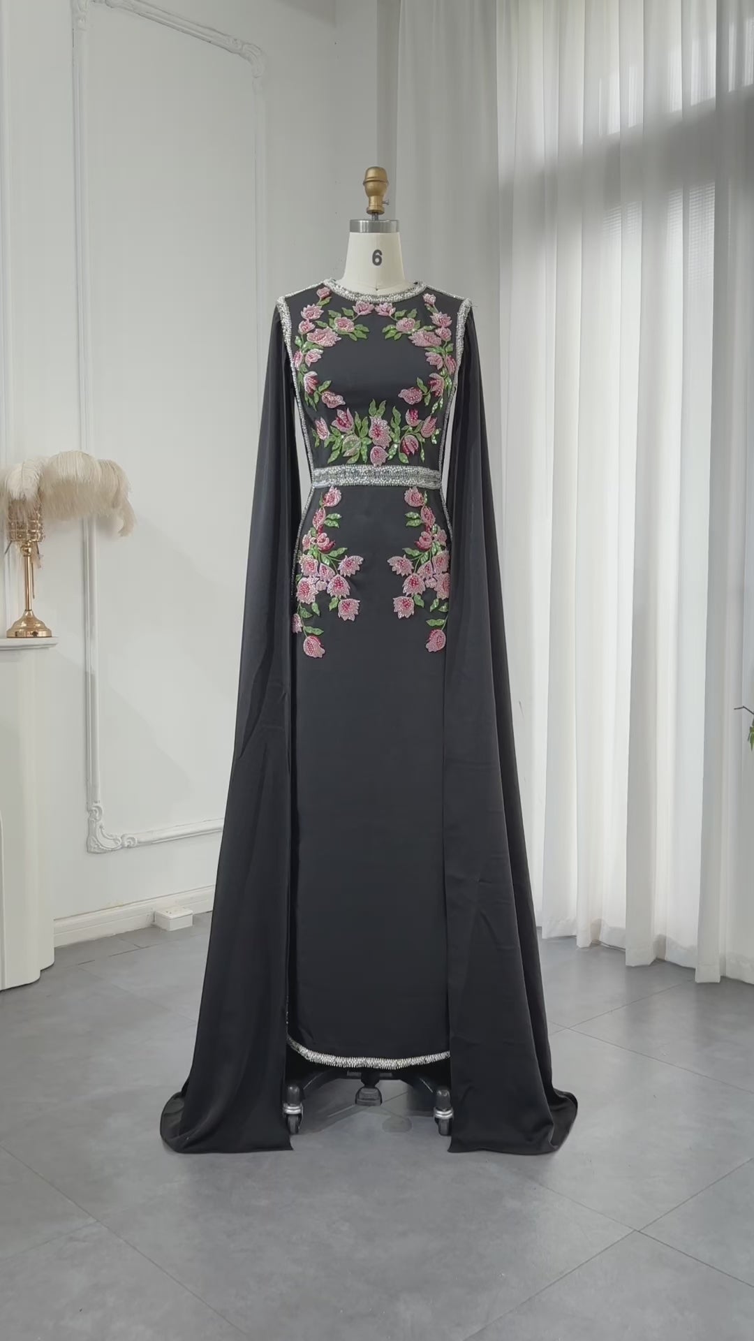 This luxury black evening dress with elegant cape sleeves features intricate embroidery and delicate pearl detailing. Made with high-quality materials, it exudes sophistication and style. Perfect for formal events and special occasions, this dress will make you feel confident and glamorous.