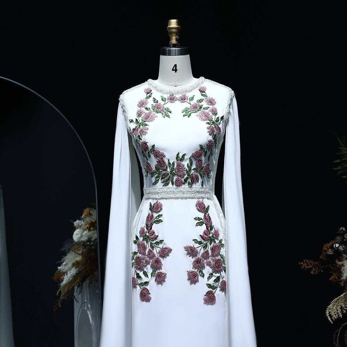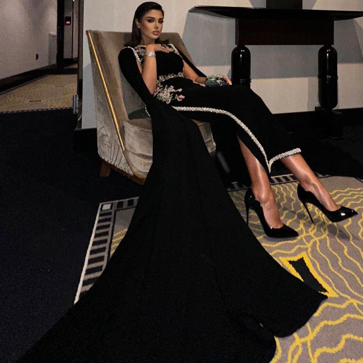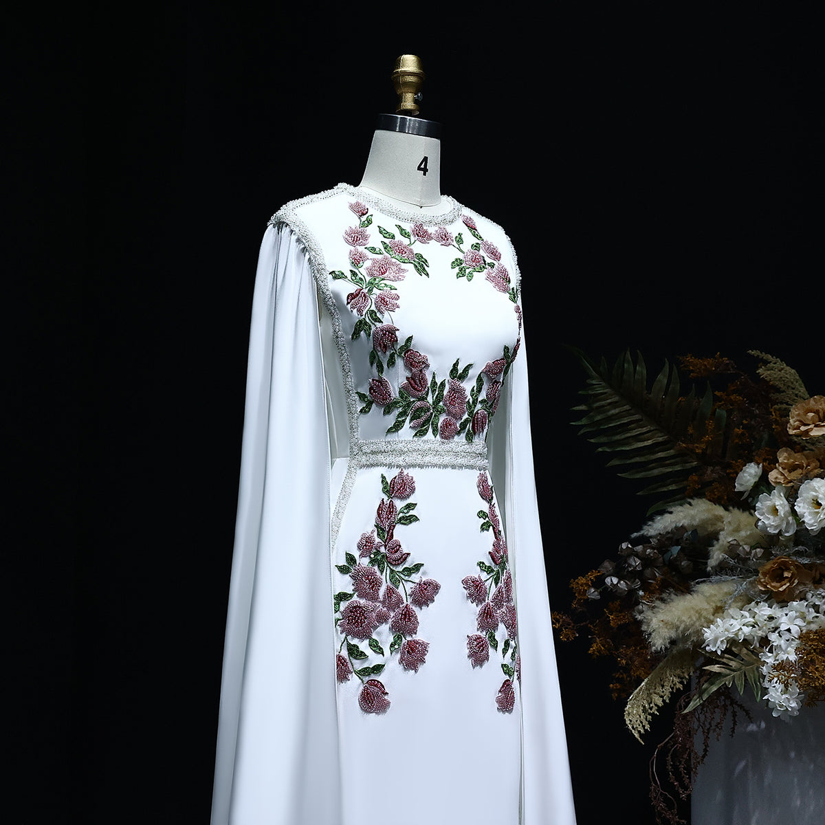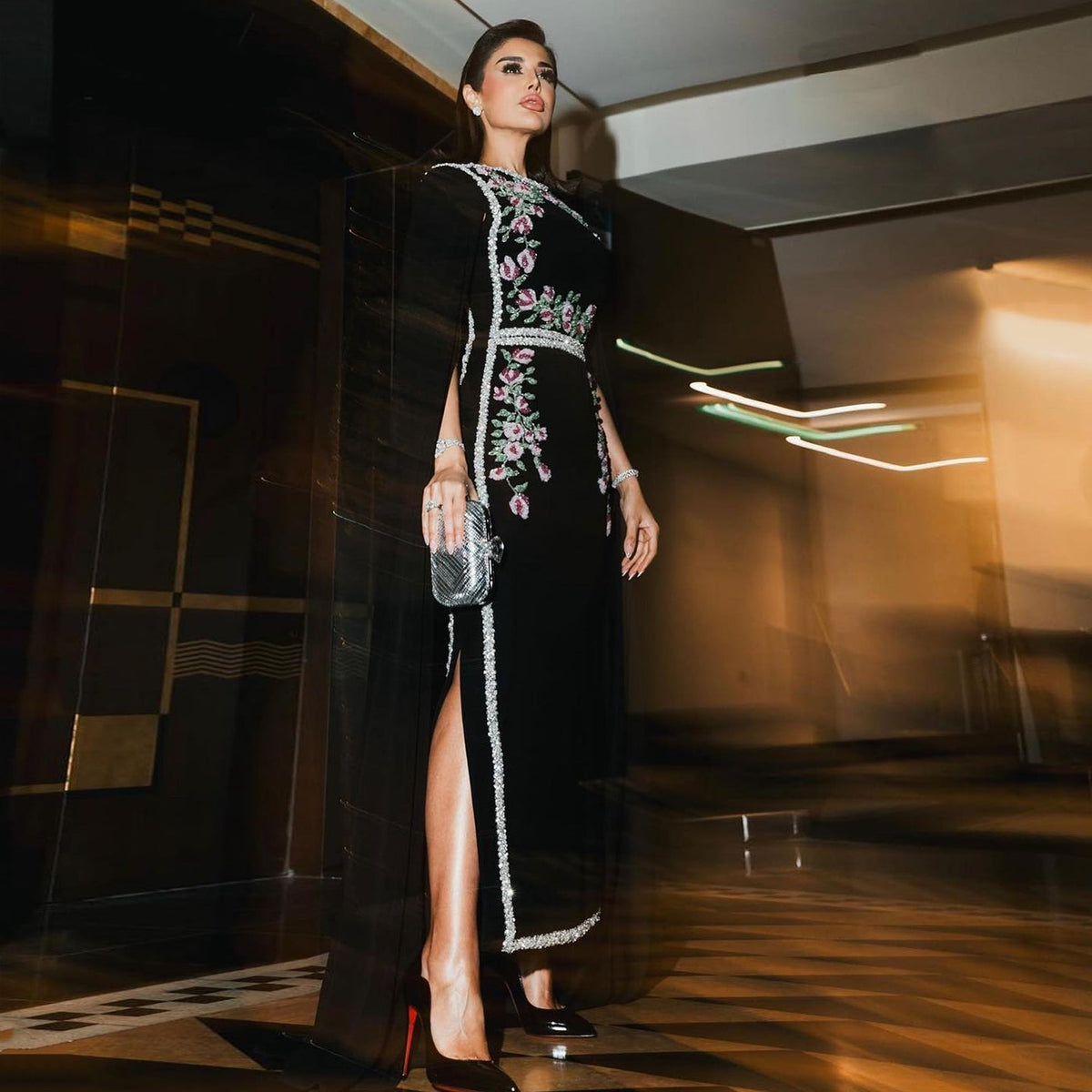 This luxury black evening dress with elegant cape sleeves features intricate embroidery and delicate pearl detailing. Made with high-quality materials, it exudes sophistication and style. Perfect for formal events and special occasions, this dress will make you feel confident and glamorous.