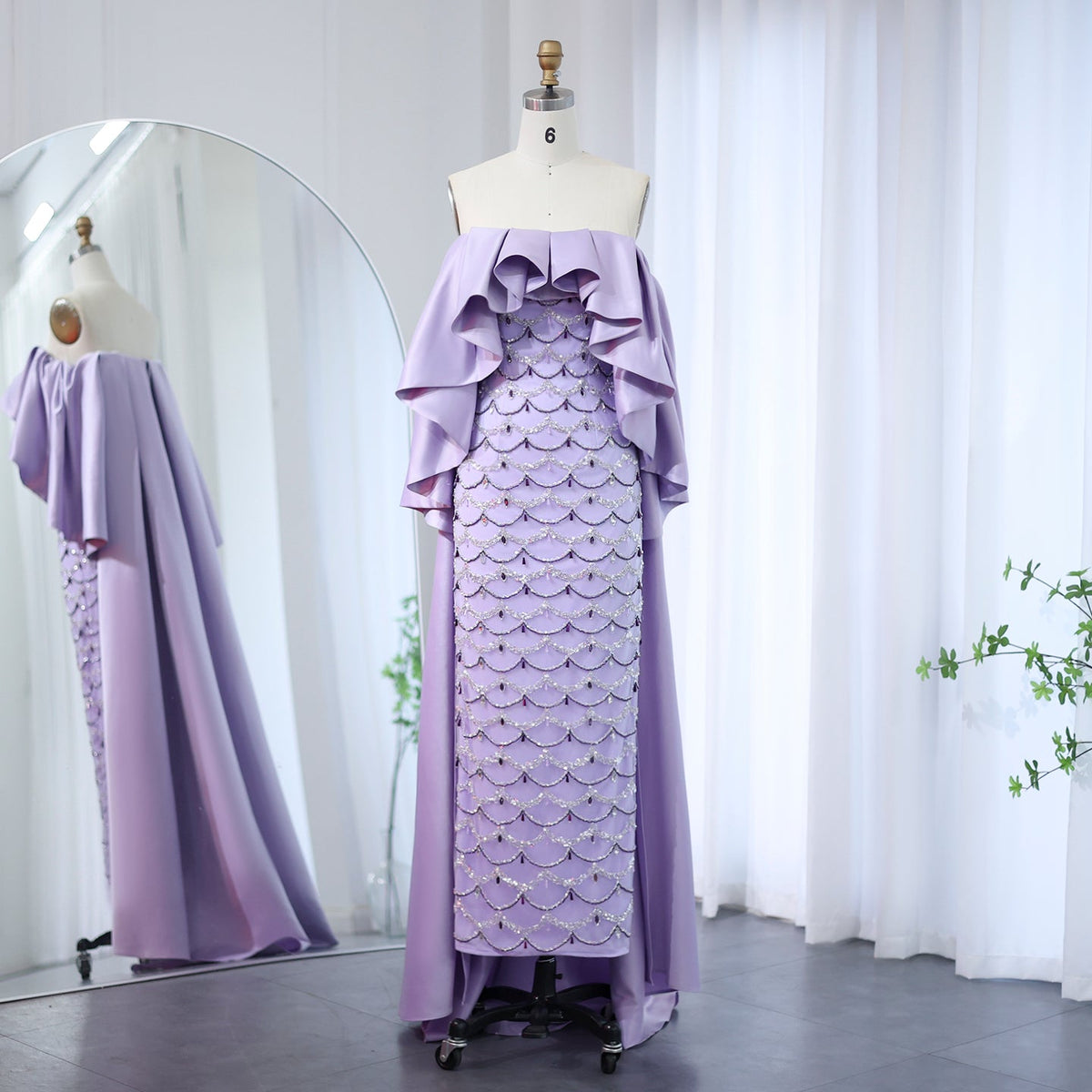 Elegant Beaded Lilac Off Shoulder Evening Dress with Cape SS341