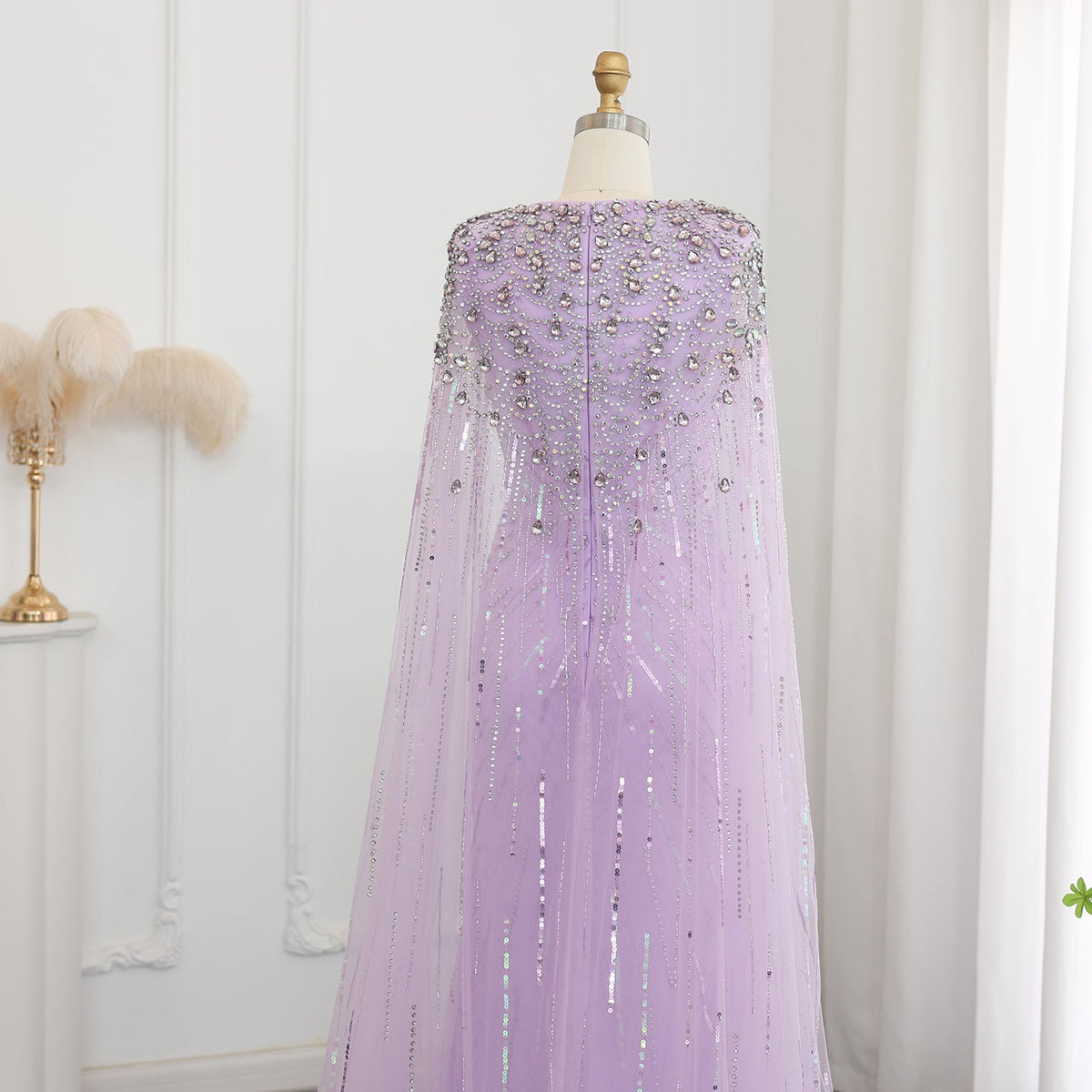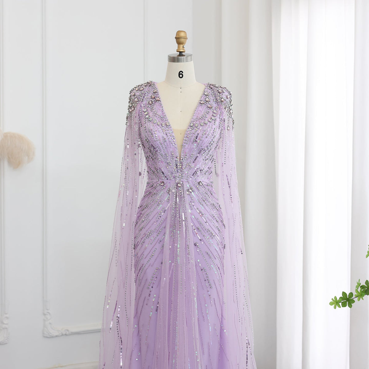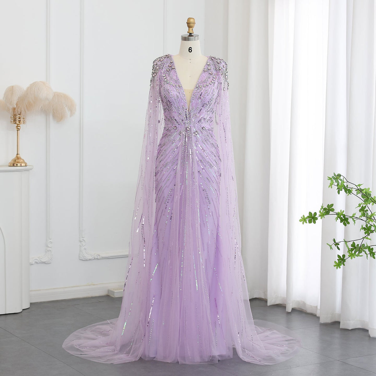 Luxury Crystal Sage Green V-Neck Evening Dresses with Cape SS399