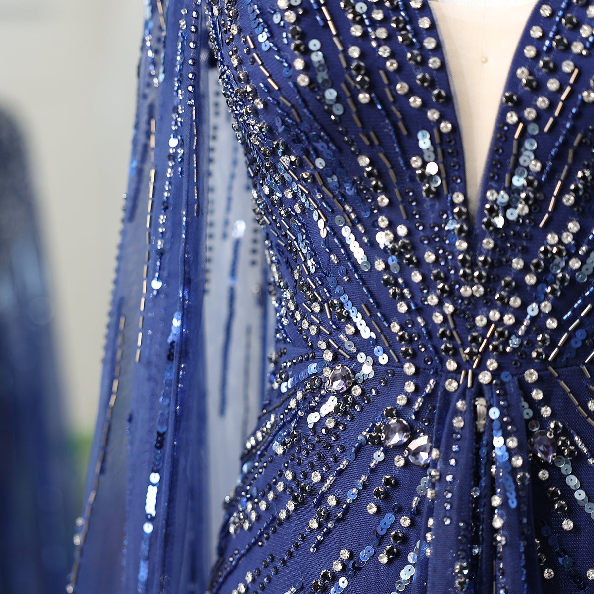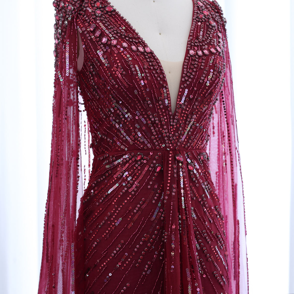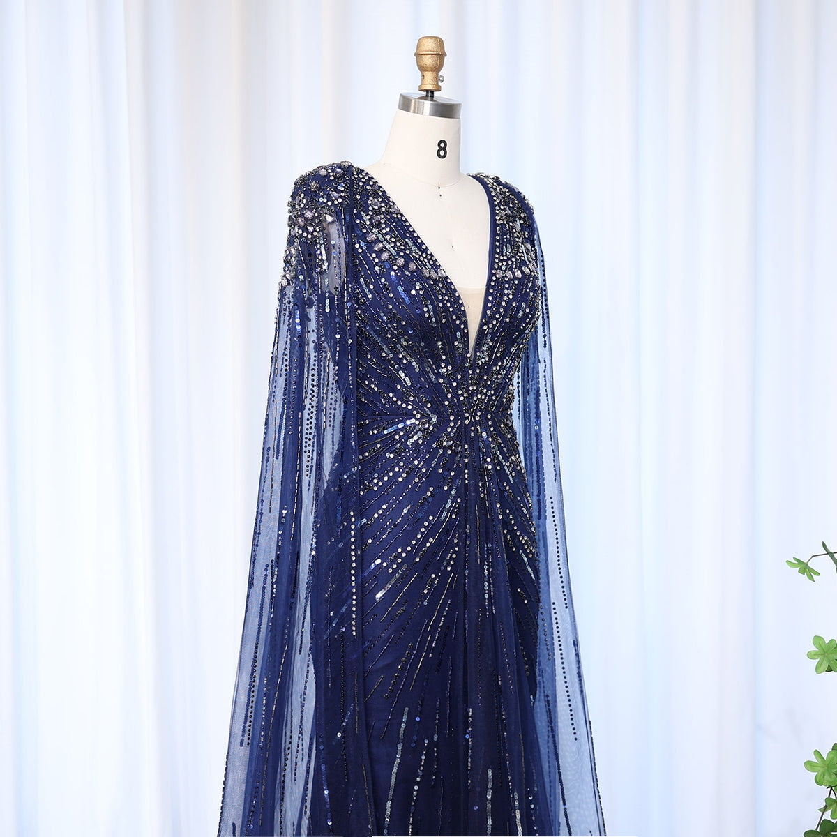 Luxury Crystal Sage Green V-Neck Evening Dresses with Cape SS399