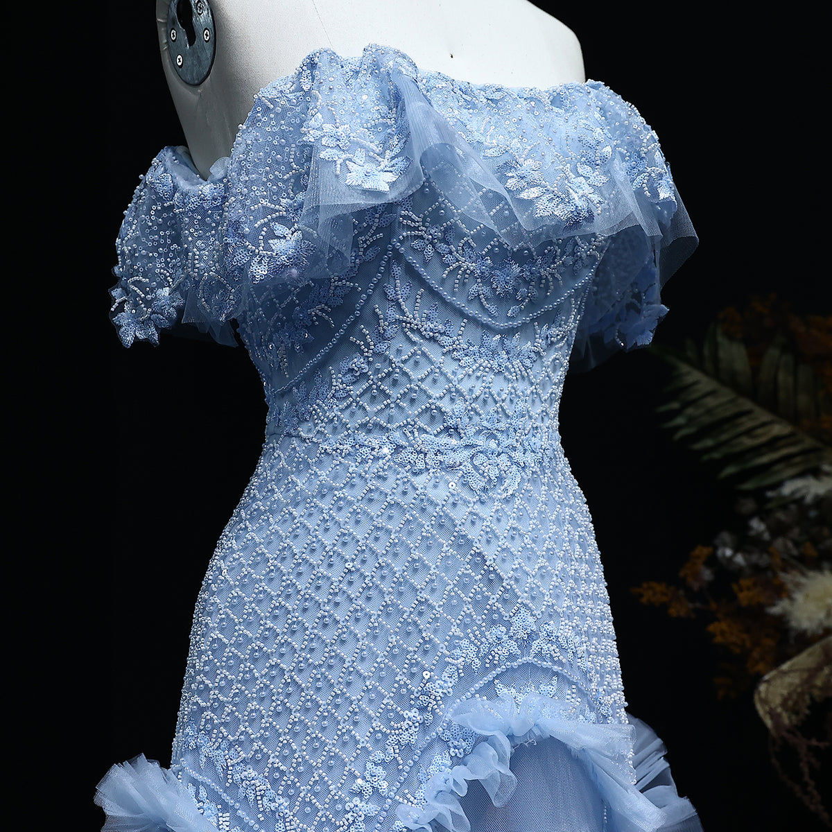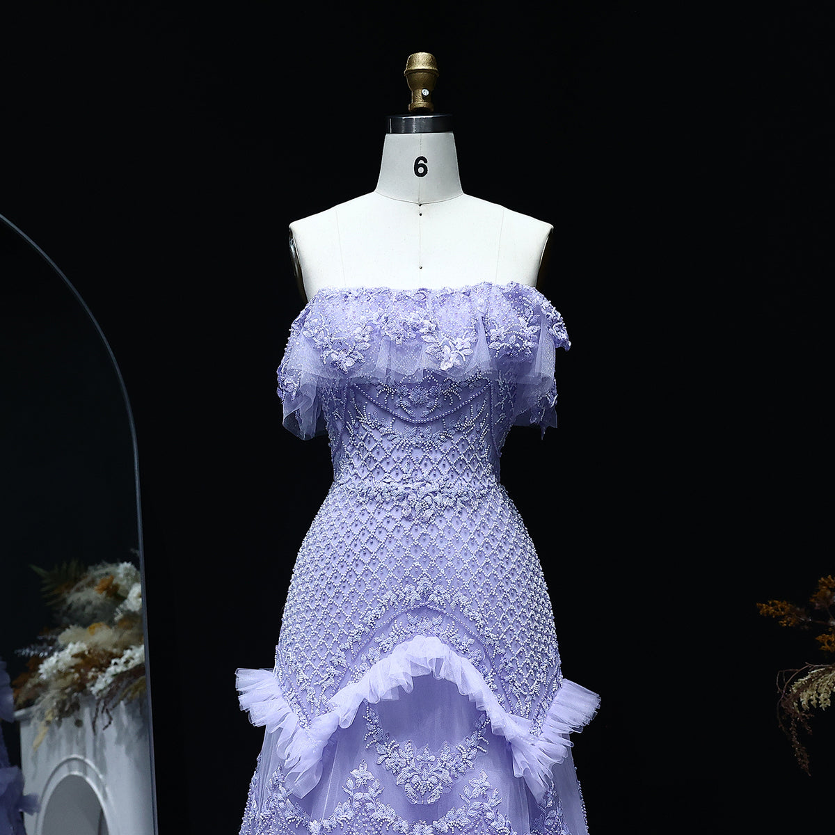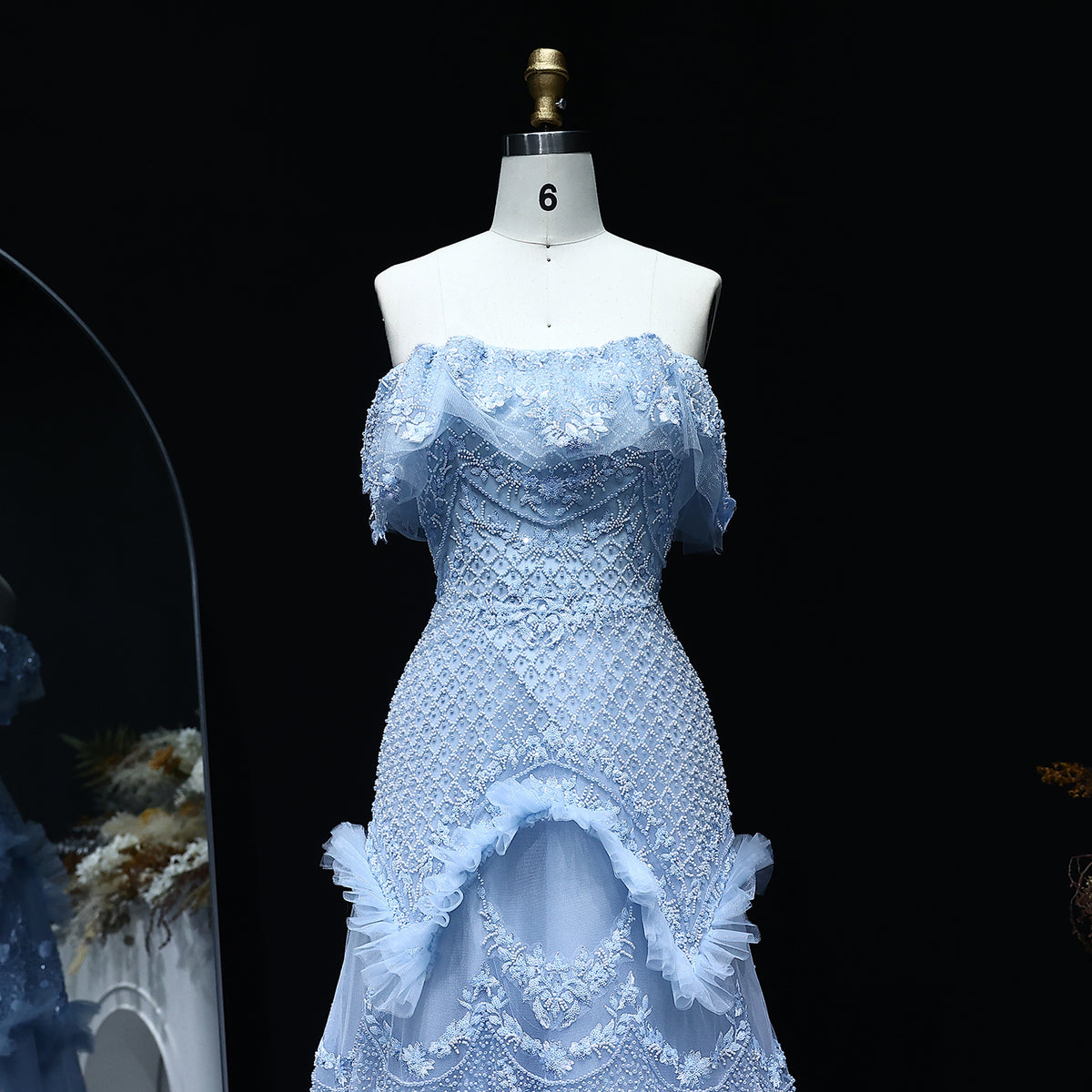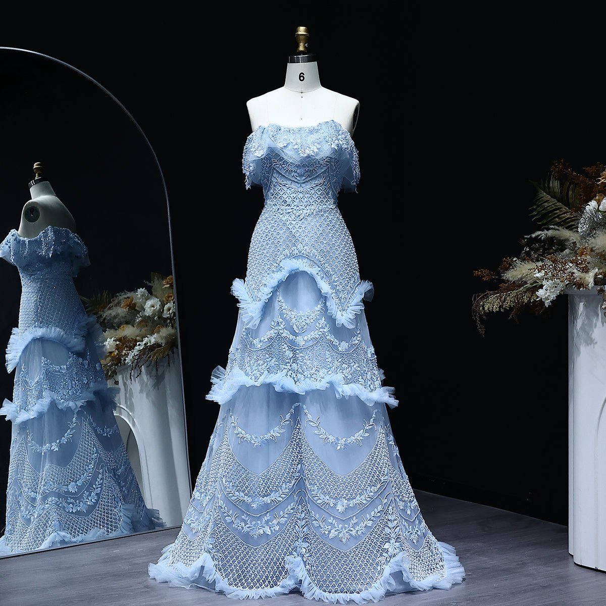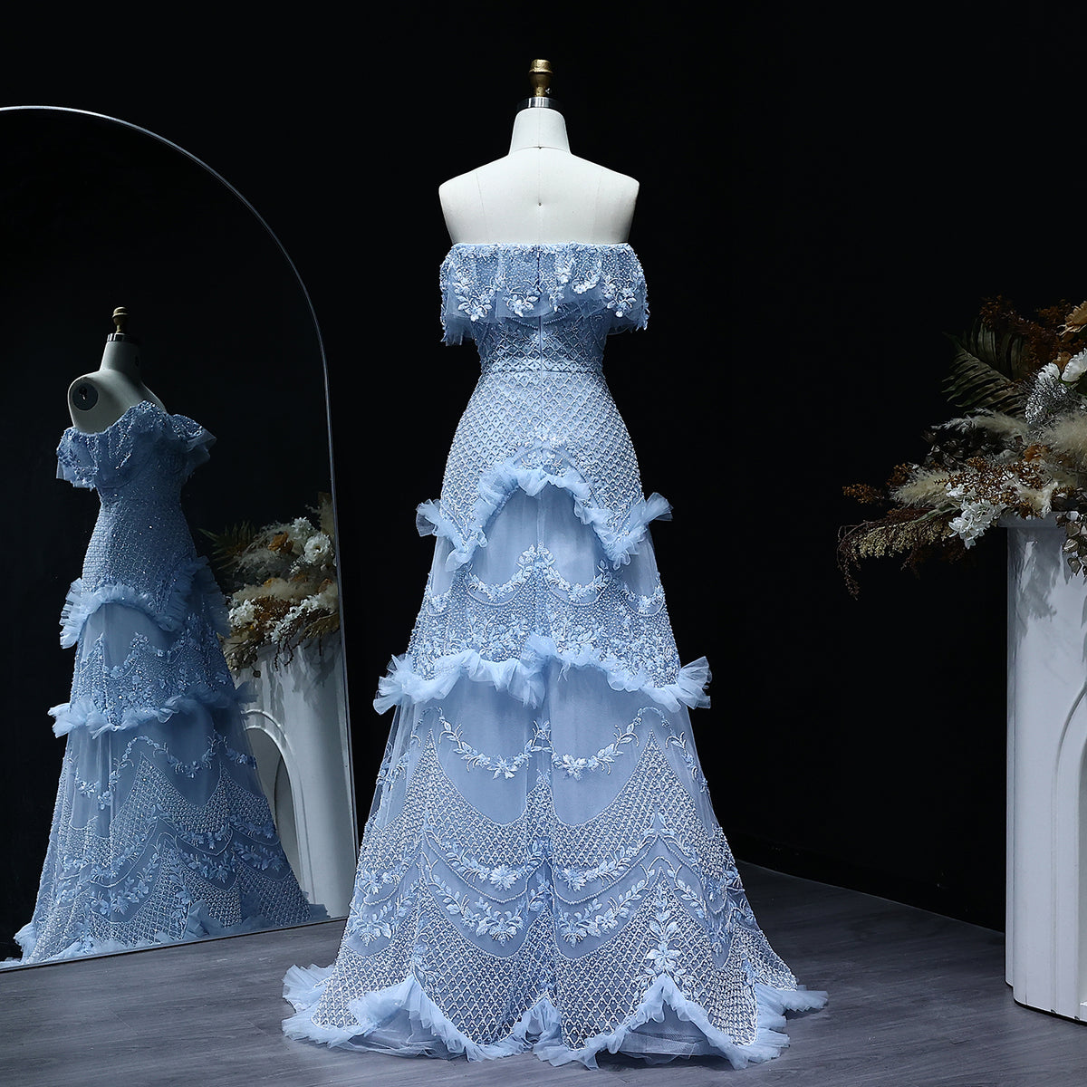 Luxury Pearls Silver Gray Off Shoulder A-Line Evening Dress SS485