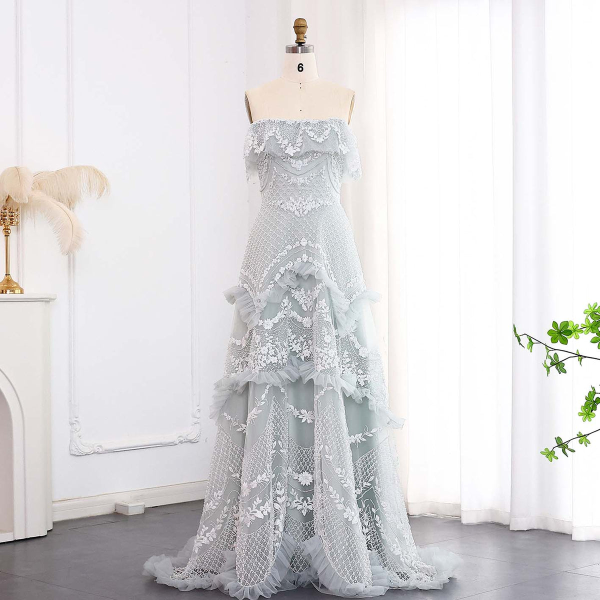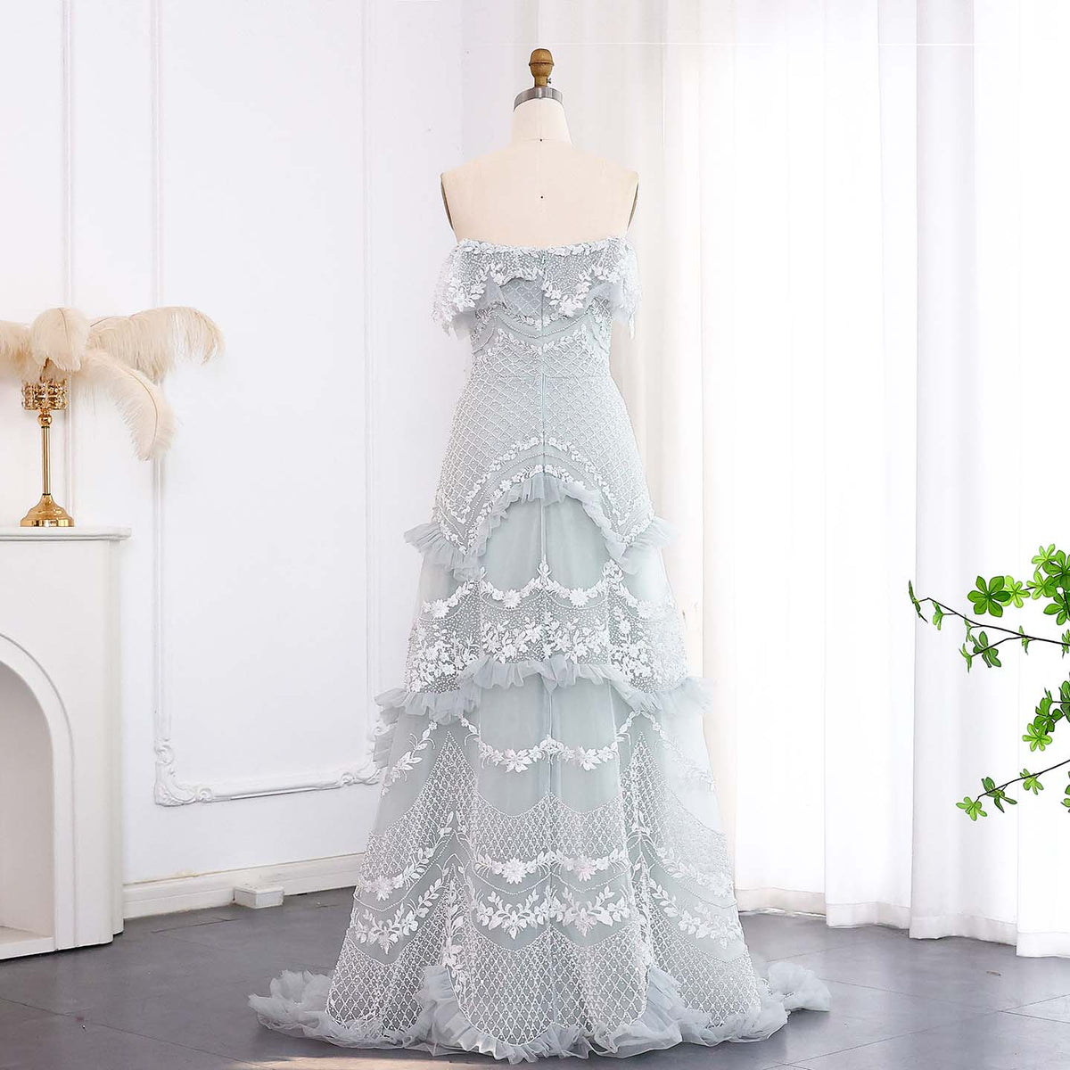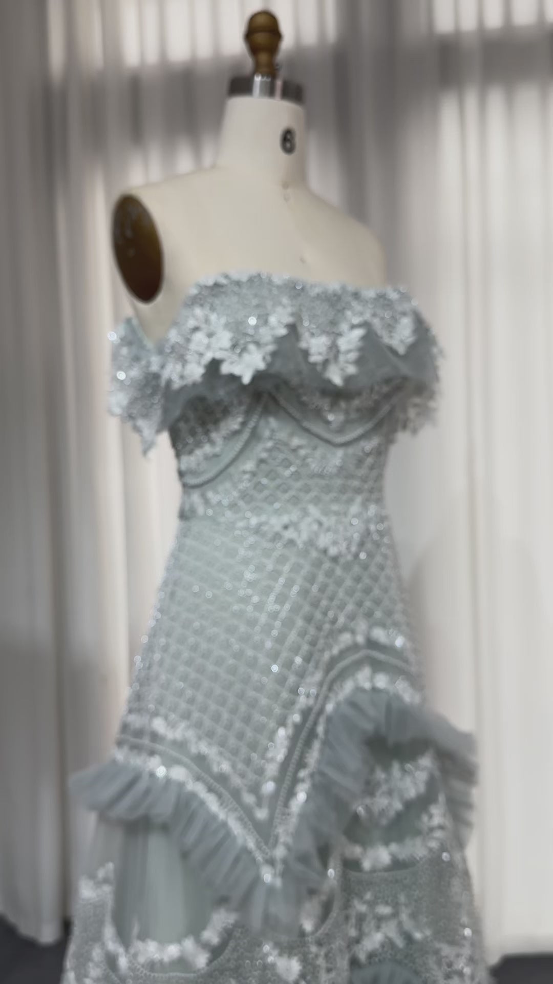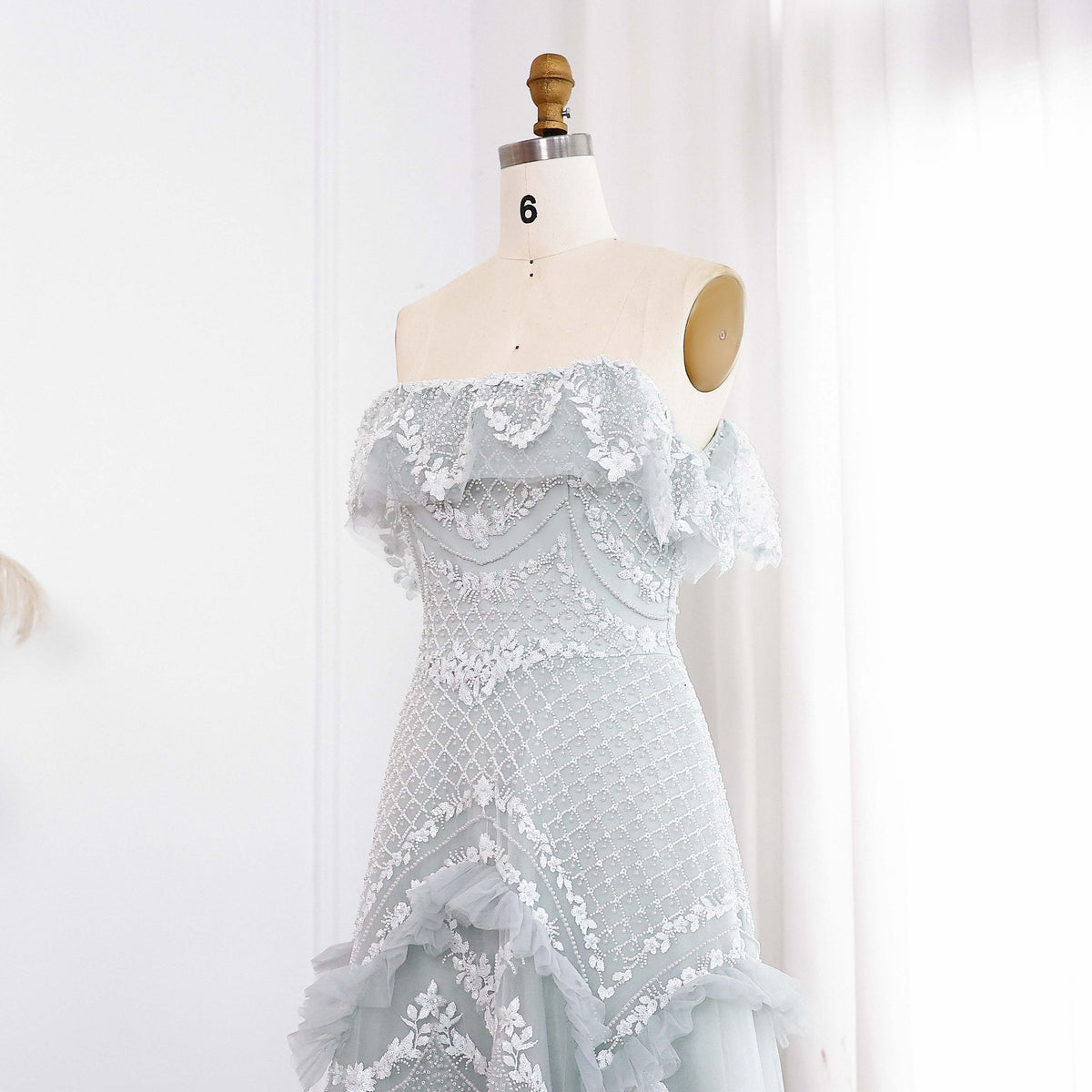 Introducing the Sharon Said Luxury Silver Gray Off Shoulder Dubai Evening Dress 2025. This elegant dress exudes sophistication with its off-shoulder design and luxurious silver gray color. Perfect for weddings and formal events, it is sure to make a statement. Elevate your style with this elegant dress by Sharon Said.