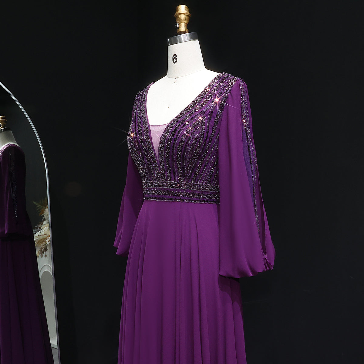 Luxury Purple Beaded Evening Dress with Sleeves SF357