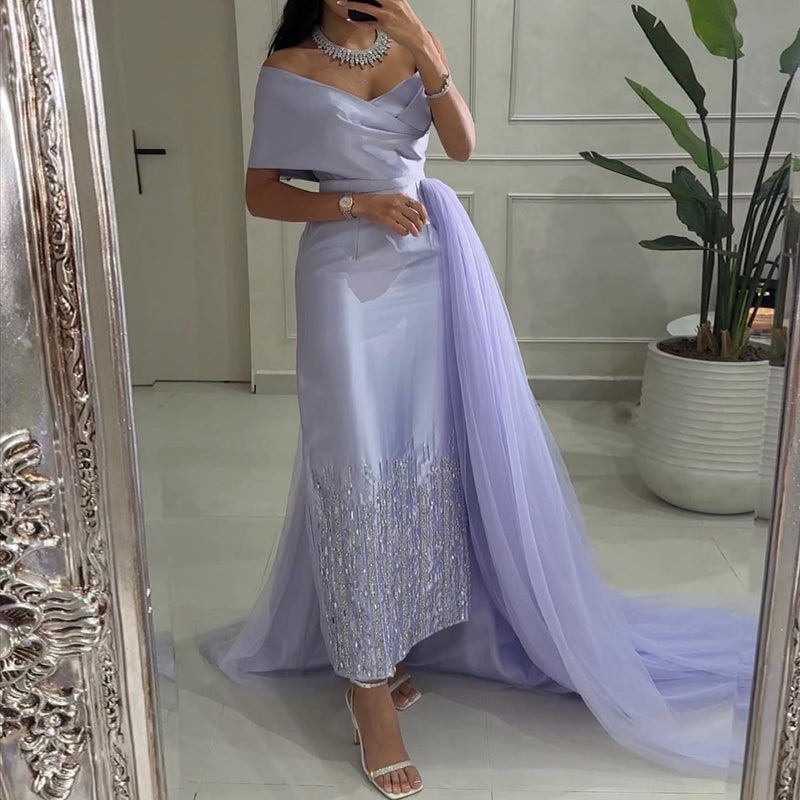 Luxury Beaded Lilac One Shoulder Evening Dress with Overskirt SS405