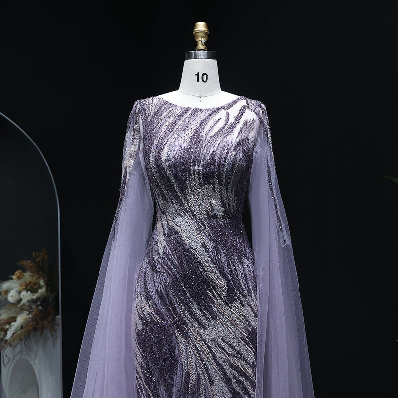 Luxury Crystal Lilac Evening Dress with Cape Sleeves SS203