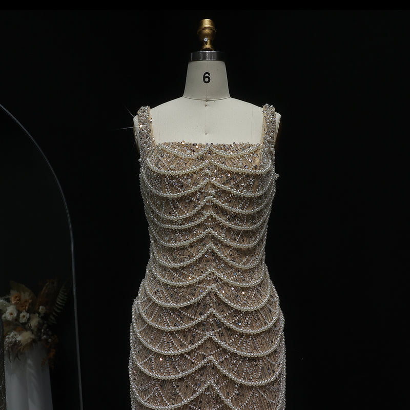 Luxury Pearls Nude Spaghetti Strap Evening Dress SS682