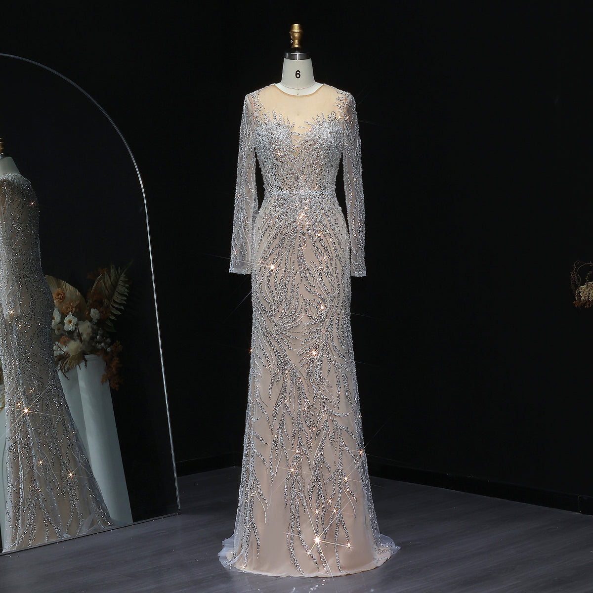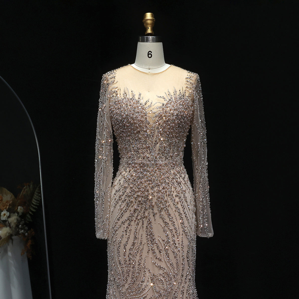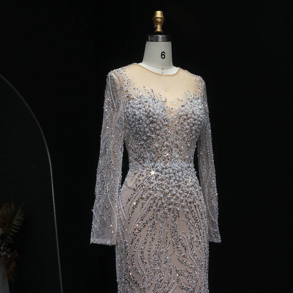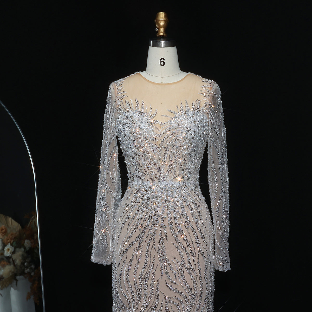 Luxury White Nude Long Sleeves Mermaid Evening Dress SS684