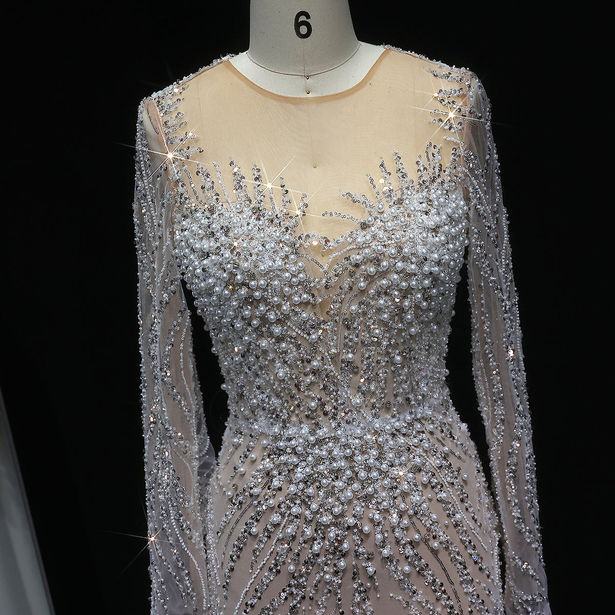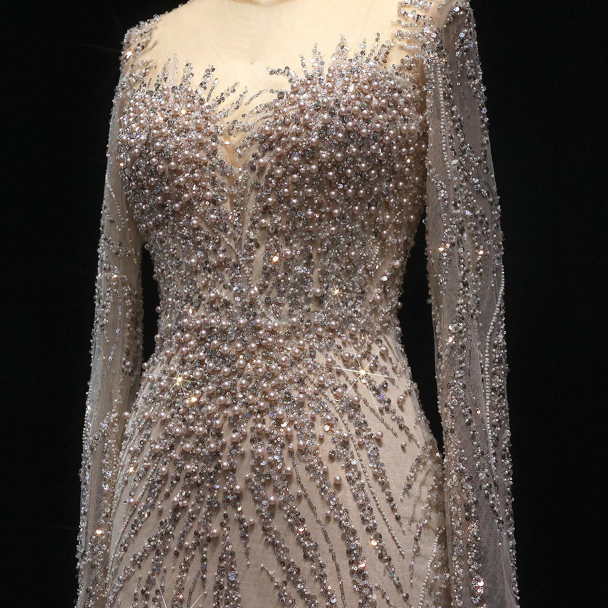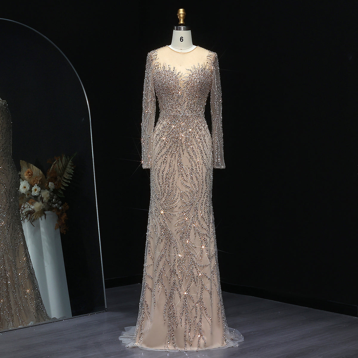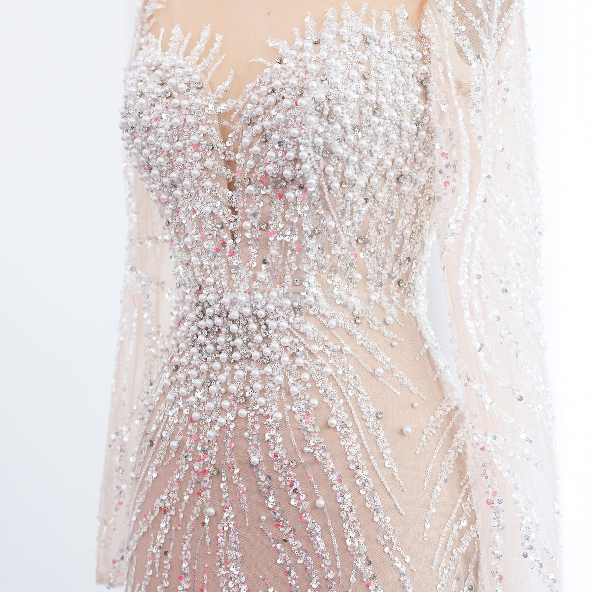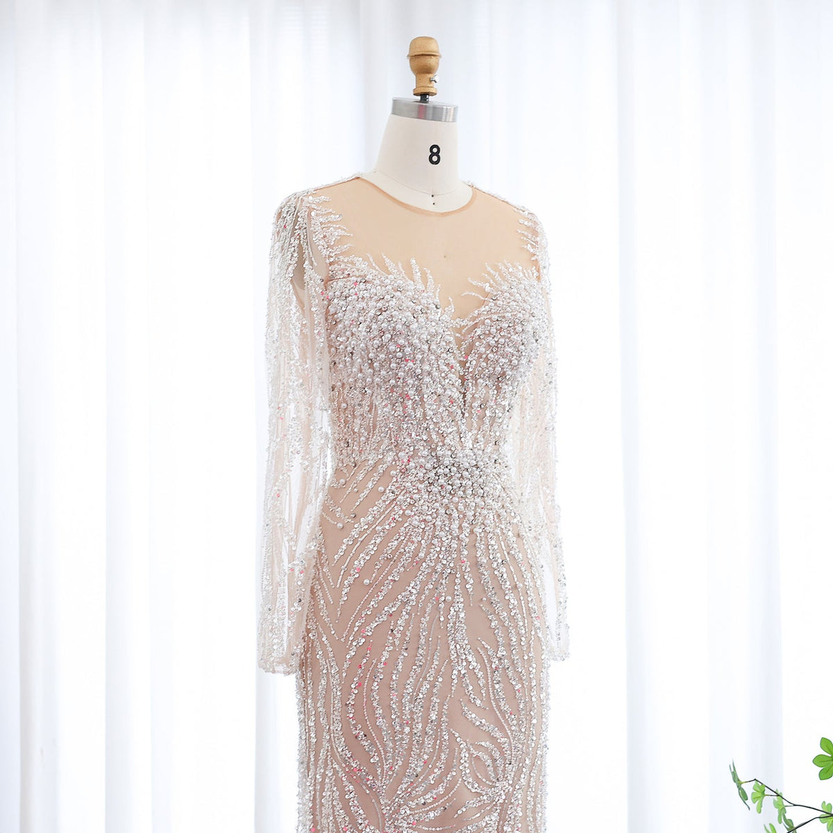Indulge in elegance with our Luxury White Nude Long Sleeves Mermaid Evening Dress SS684. This stunning piece features a mermaid silhouette and long sleeves for a sleek and sophisticated look. Perfect for evening events, this dress will make you feel like royalty.