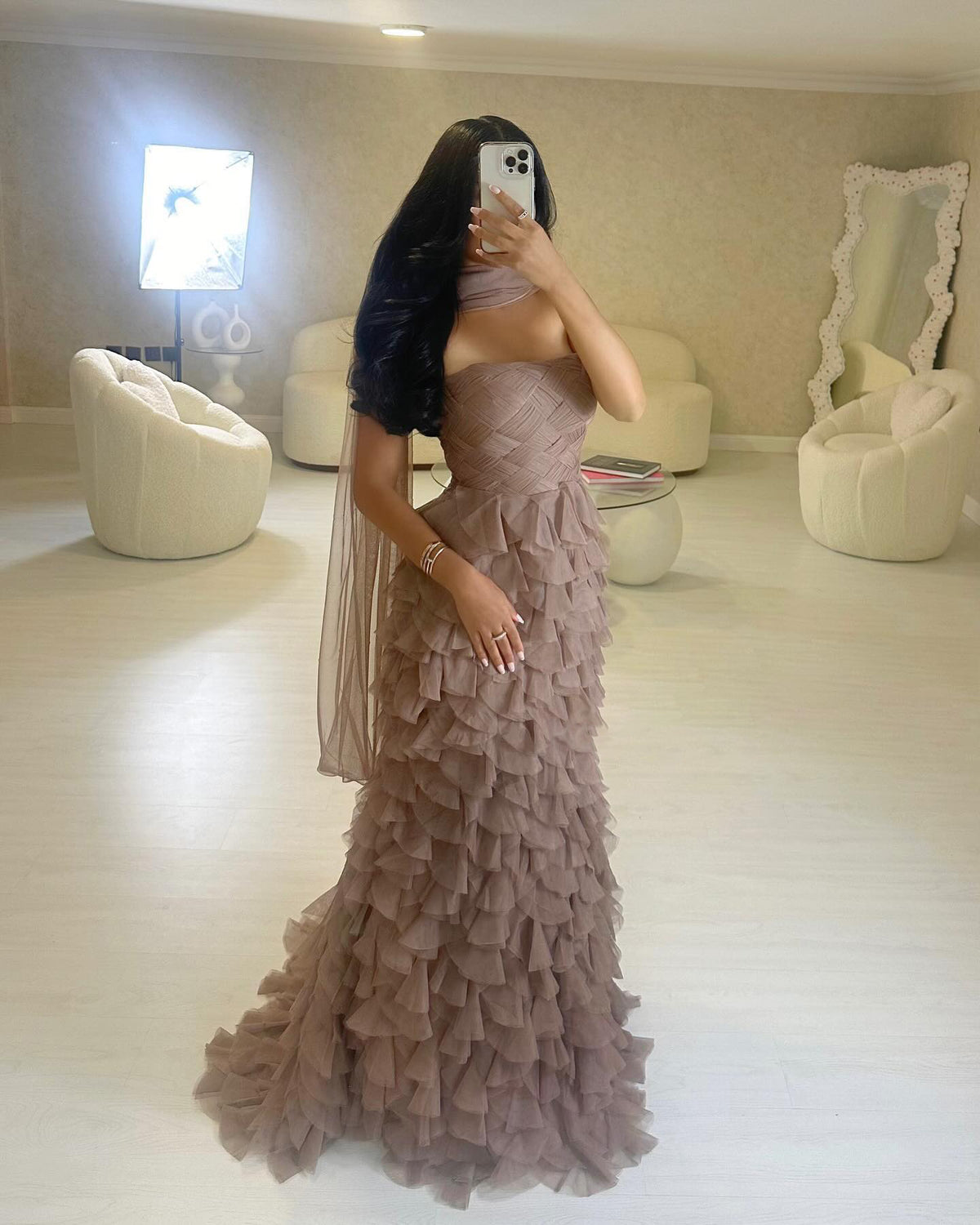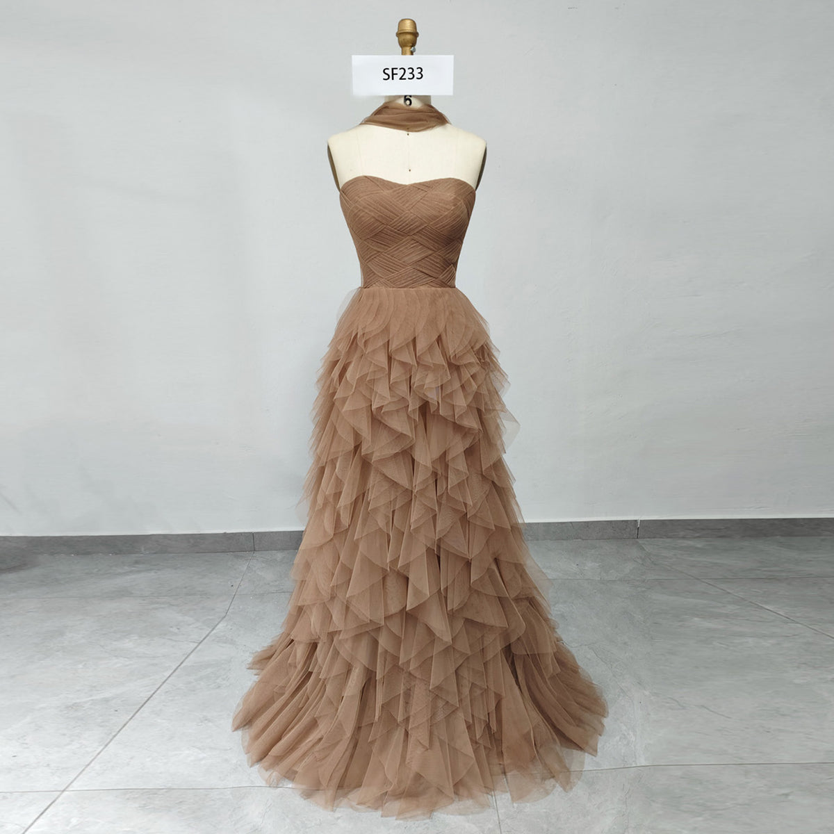 Luxury Light Brown Layered Tulle Evening Dress with Scarf SF233