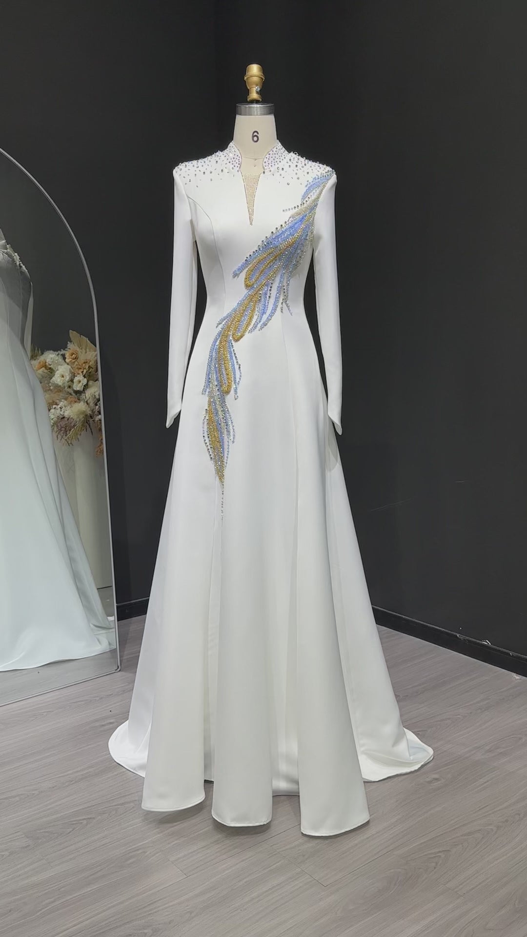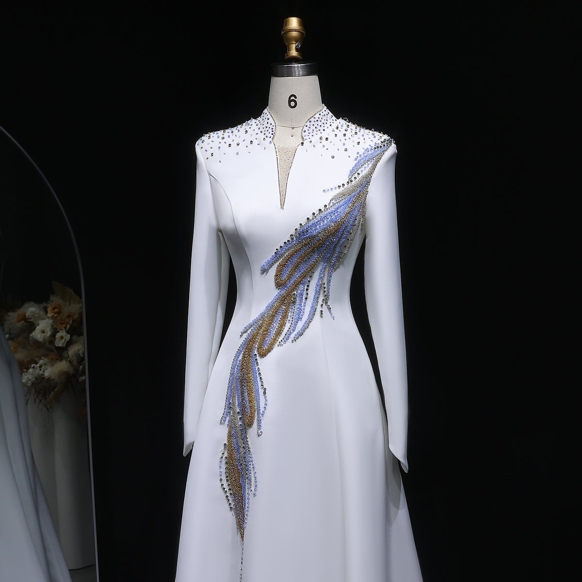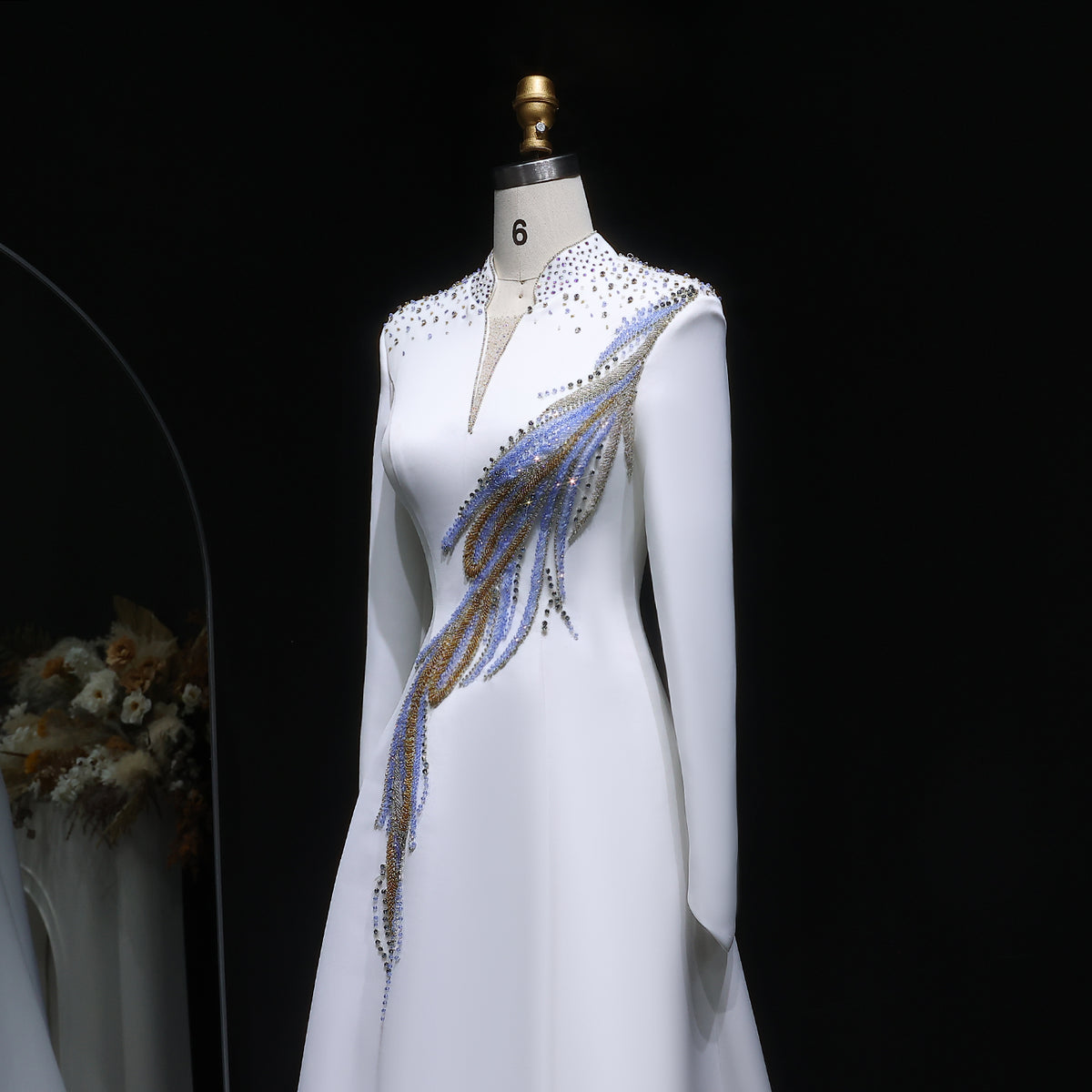 This luxury white long sleeve evening dress features intricate embroidery that enhances its elegant design. Crafted with premium materials, it offers a refined silhouette ideal for formal occasions. The long sleeves provide graceful coverage while maintaining sophistication, making it a timeless choice for evening events.