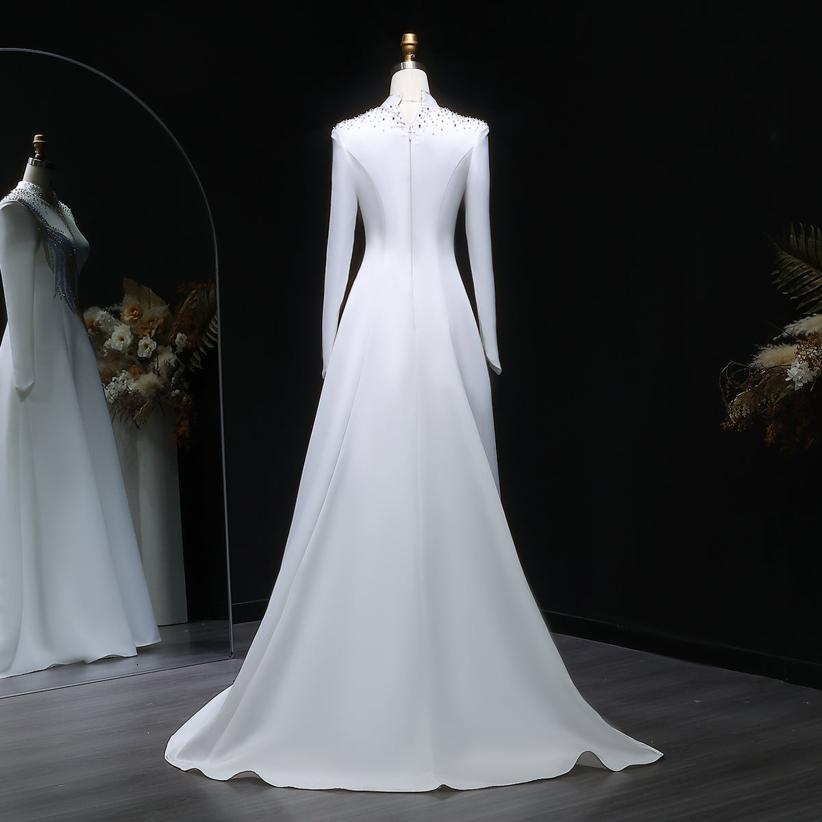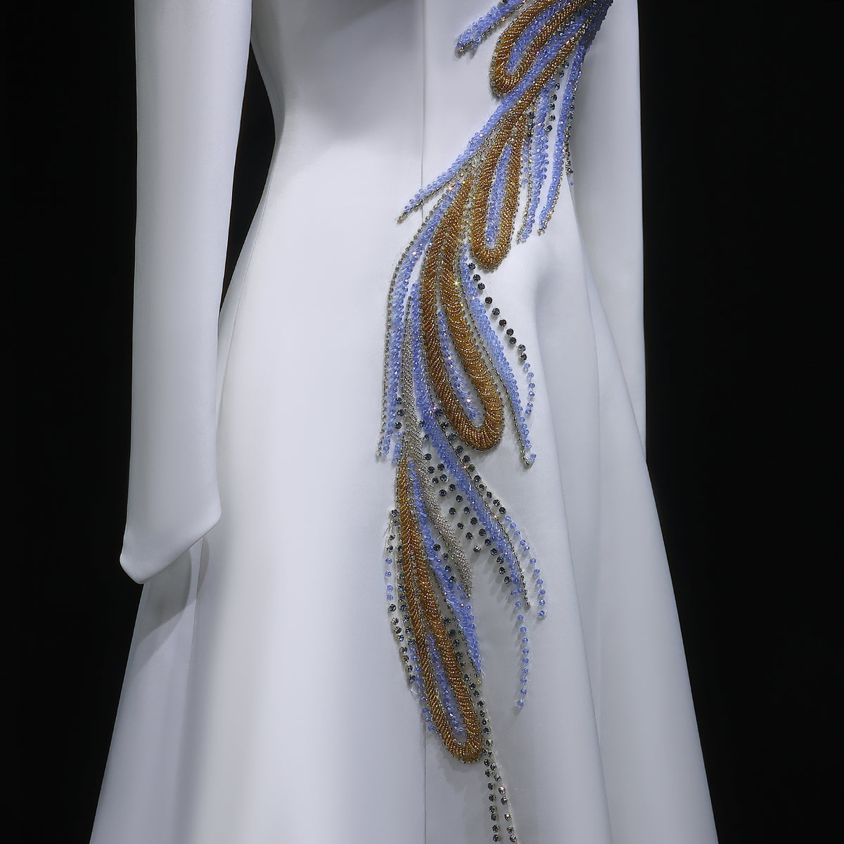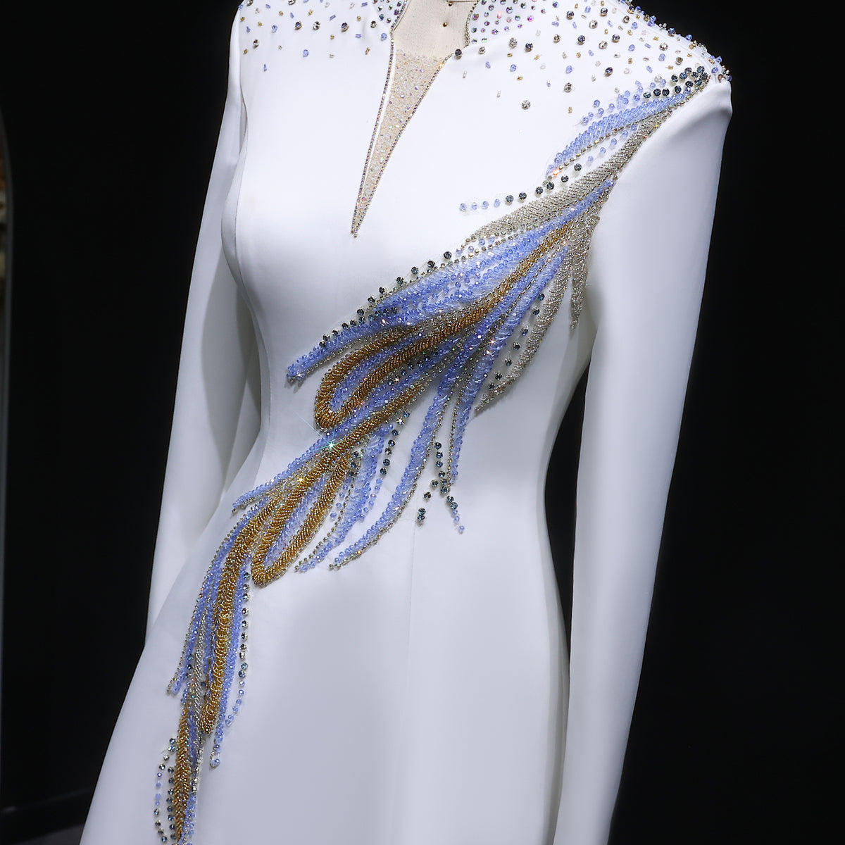This luxury white long sleeve evening dress features intricate embroidery that enhances its elegant design. Crafted with premium materials, it offers a refined silhouette ideal for formal occasions. The long sleeves provide graceful coverage while maintaining sophistication, making it a timeless choice for evening events.
