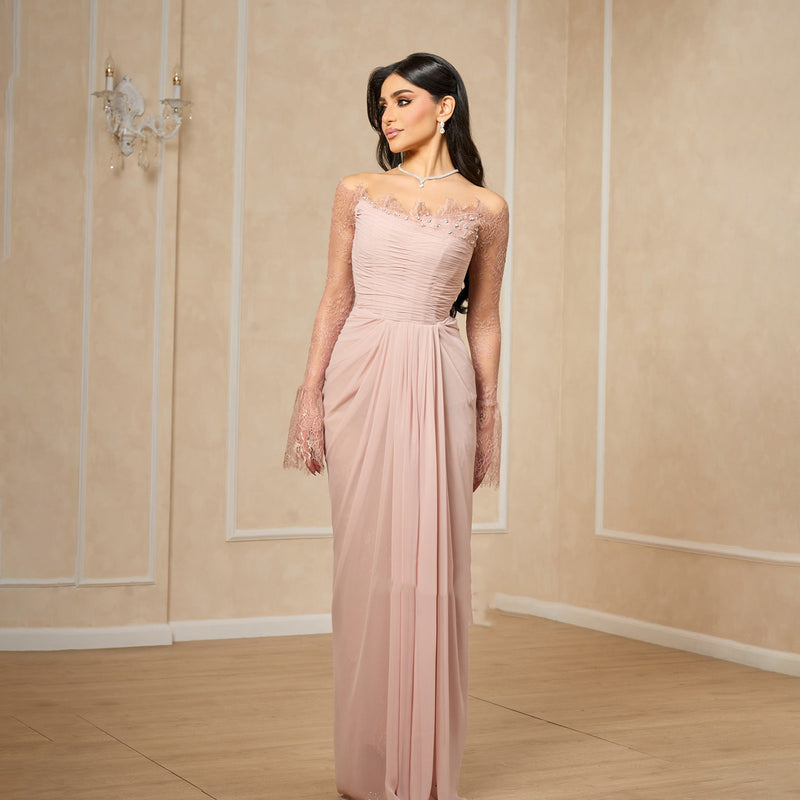 Elegant Crystal Pink Lace Long Sleeve Evening Dress with ruffles SF397