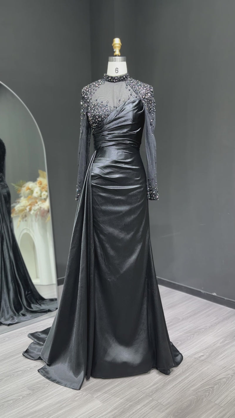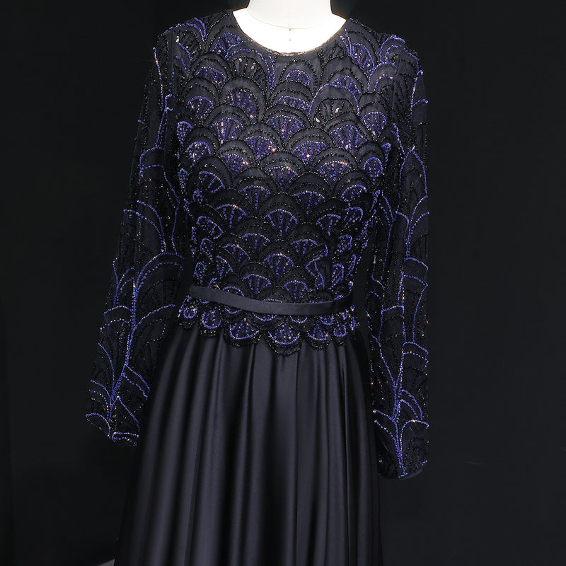 Elegant Black Beaded Evening Dress with Sleeves SF320