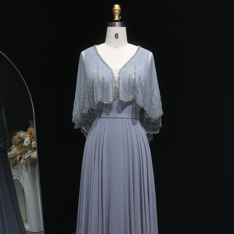 Elegant Gray Beaded Evening Dress with Cape SF327