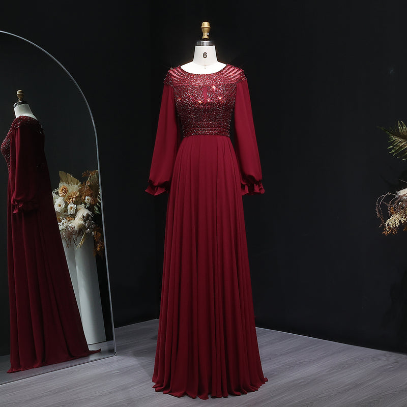 Luxury Beaded Burgundy Turkish Evening Dress with Sleeves SF354