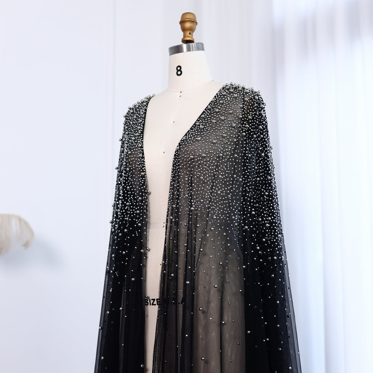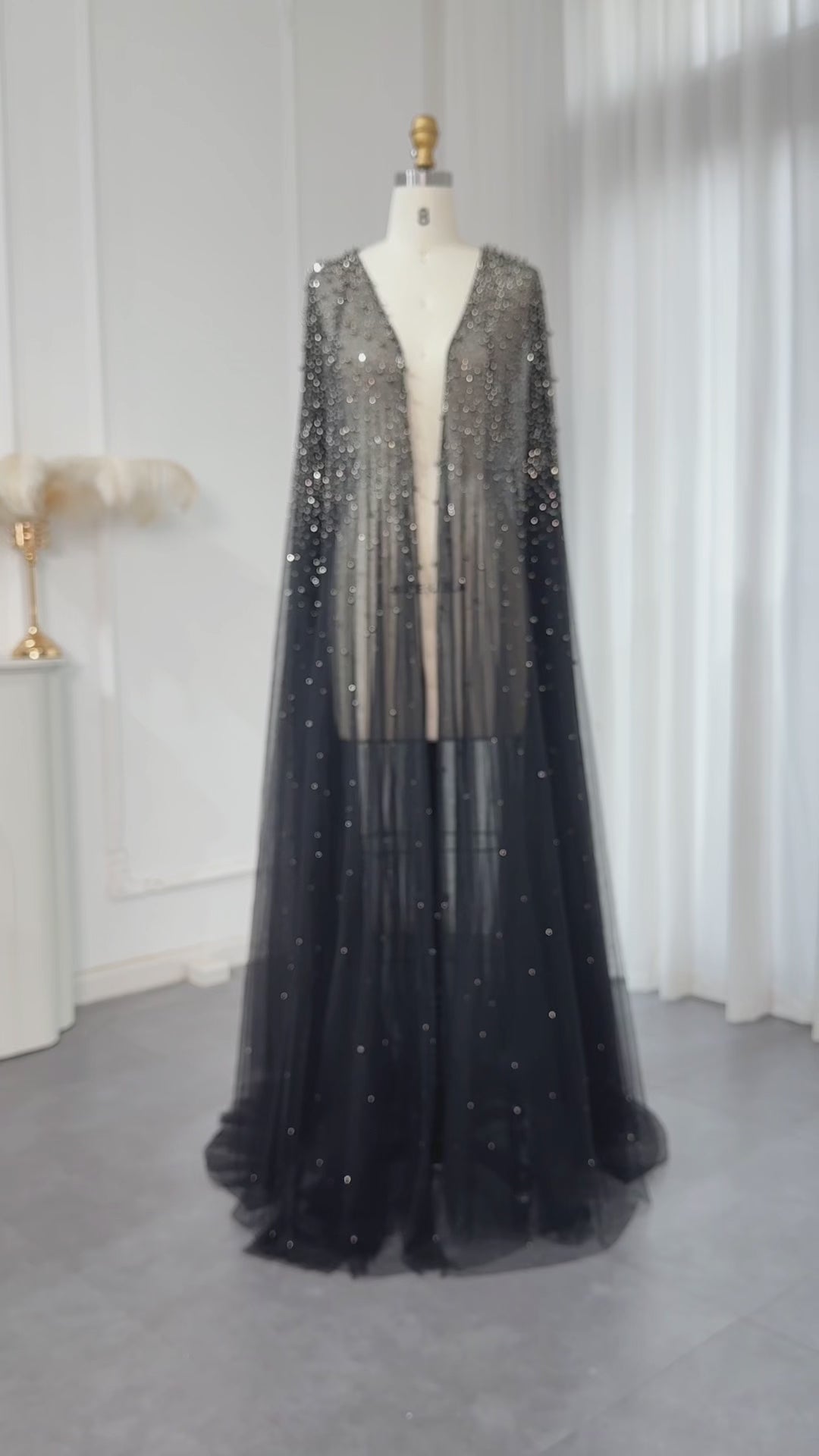Elegant Black Beaded Long Cape Evening Dress SF082