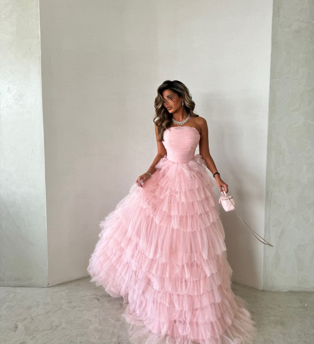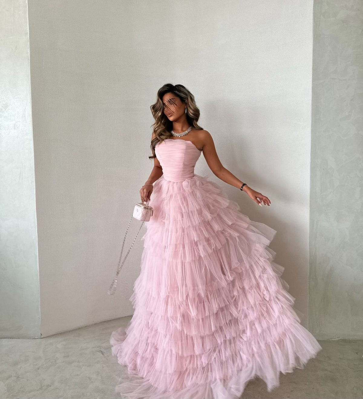 This luxurious evening dress features a strapless design and a flattering A-line shape with elegant pink tiered layers. Perfect for formal events or special occasions, this dress exudes elegance and sophistication. Made with high-quality materials, you'll feel confident and stunning all night long.