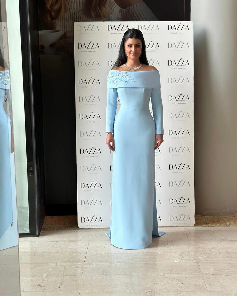 Elegant Pearls Off Shoulder Blue Evening Dress SF404