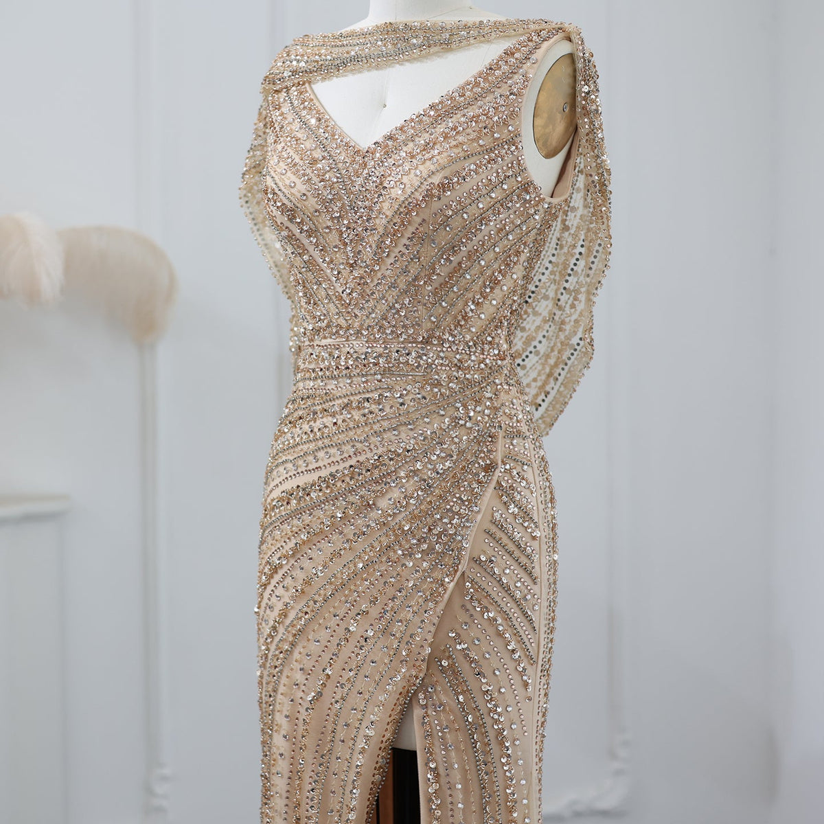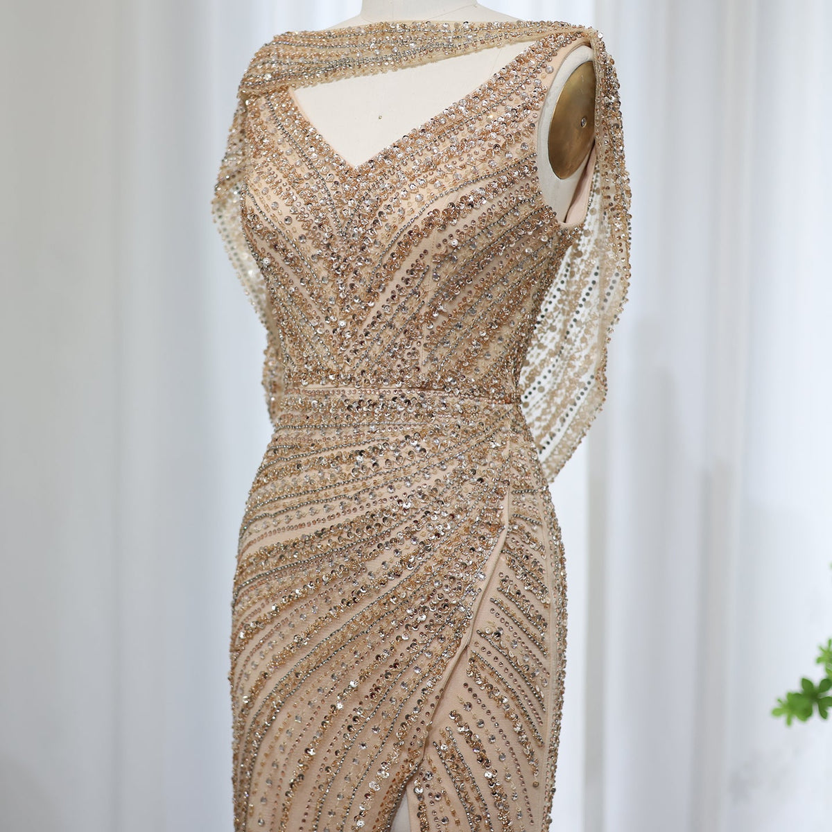 Luxury Beaded Silver Mermaid Evening Dress with Cape SS035