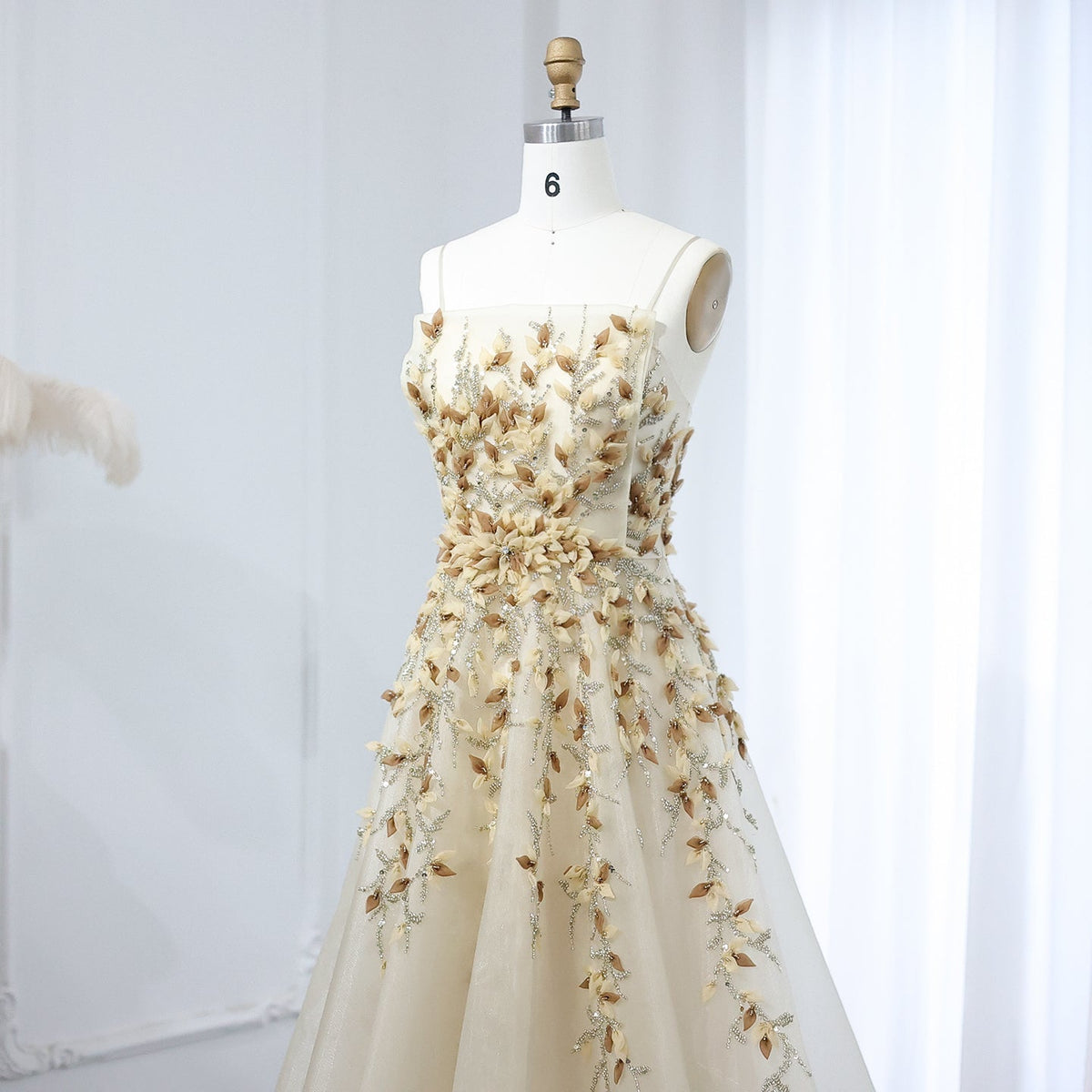 Luxury Beige Evening Dress with 3D Floral Embroidery SS362
