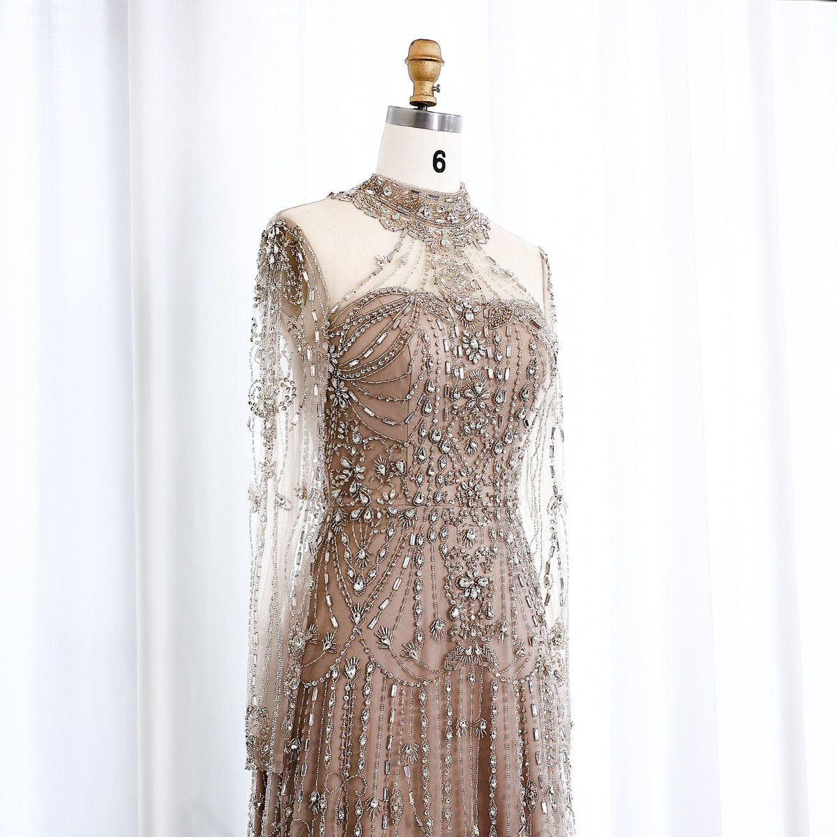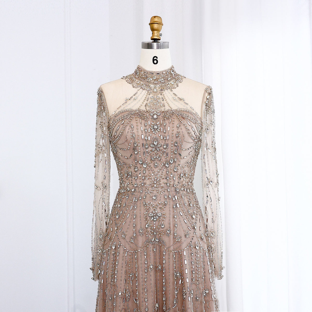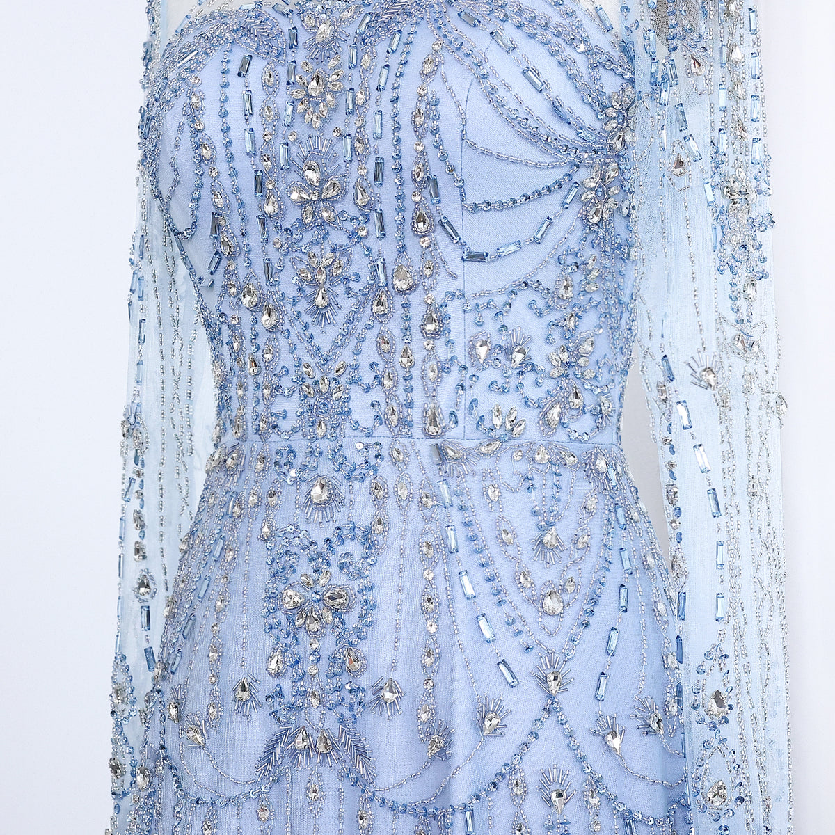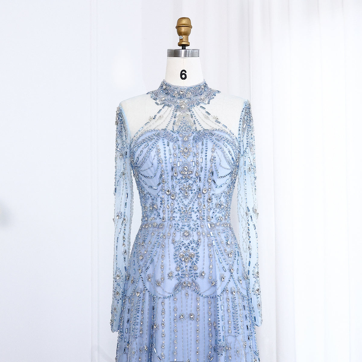 Indulge in luxury and elegance with our gorgeous blue evening dress. The high neck and long sleeves provide sophistication while the beautiful blue color adds a pop of color. Perfect for formal events or special occasions.