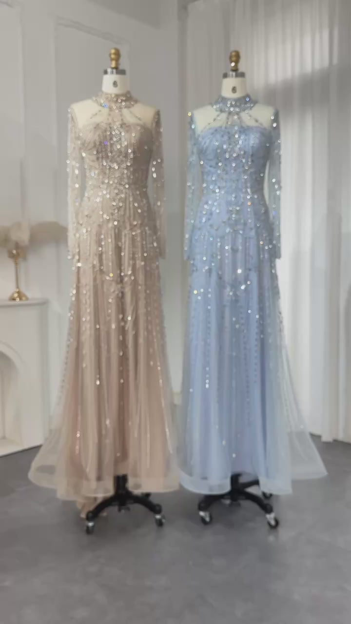 Luxury Blue Long Sleeves High Neck Evening Dress SS587