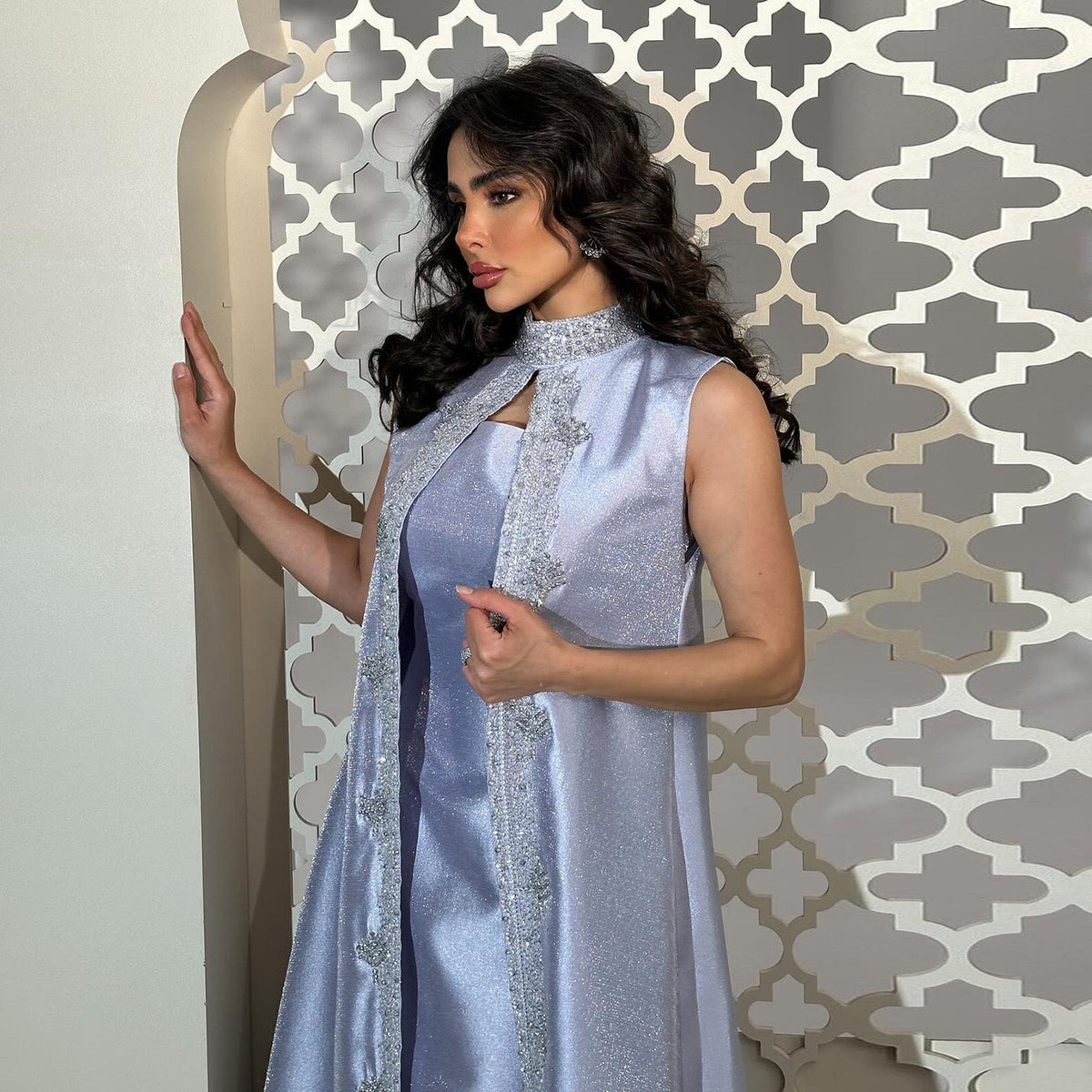 Indulge in pure luxury with our Rhinestone Lilac Kaftan Evening Dress and Cape. This stunning two-piece set features intricate rhinestone detailing and a flowing cape, perfect for any special occasion. Stand out in elegance and sophistication.
