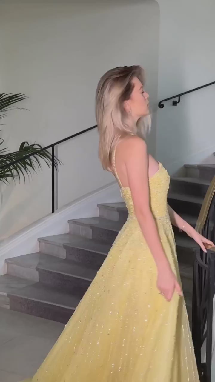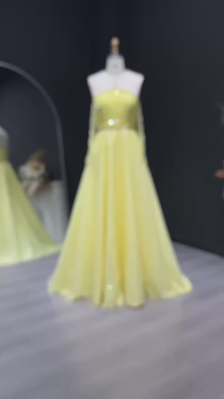 Sparkly Beaded Yellow Halter Neck Evening Dress with Gloves SS313