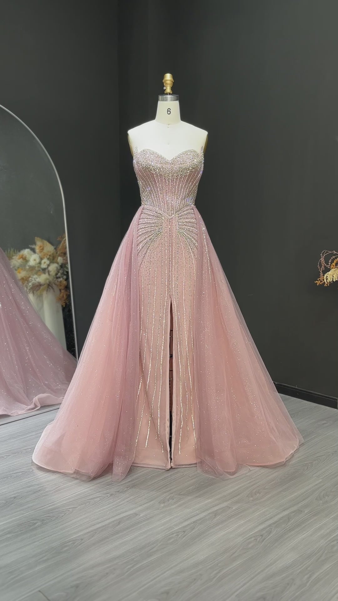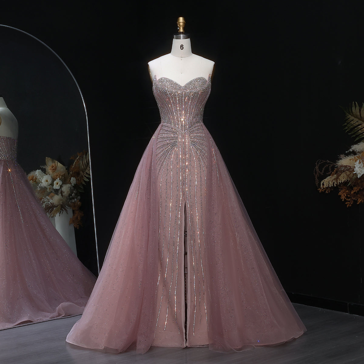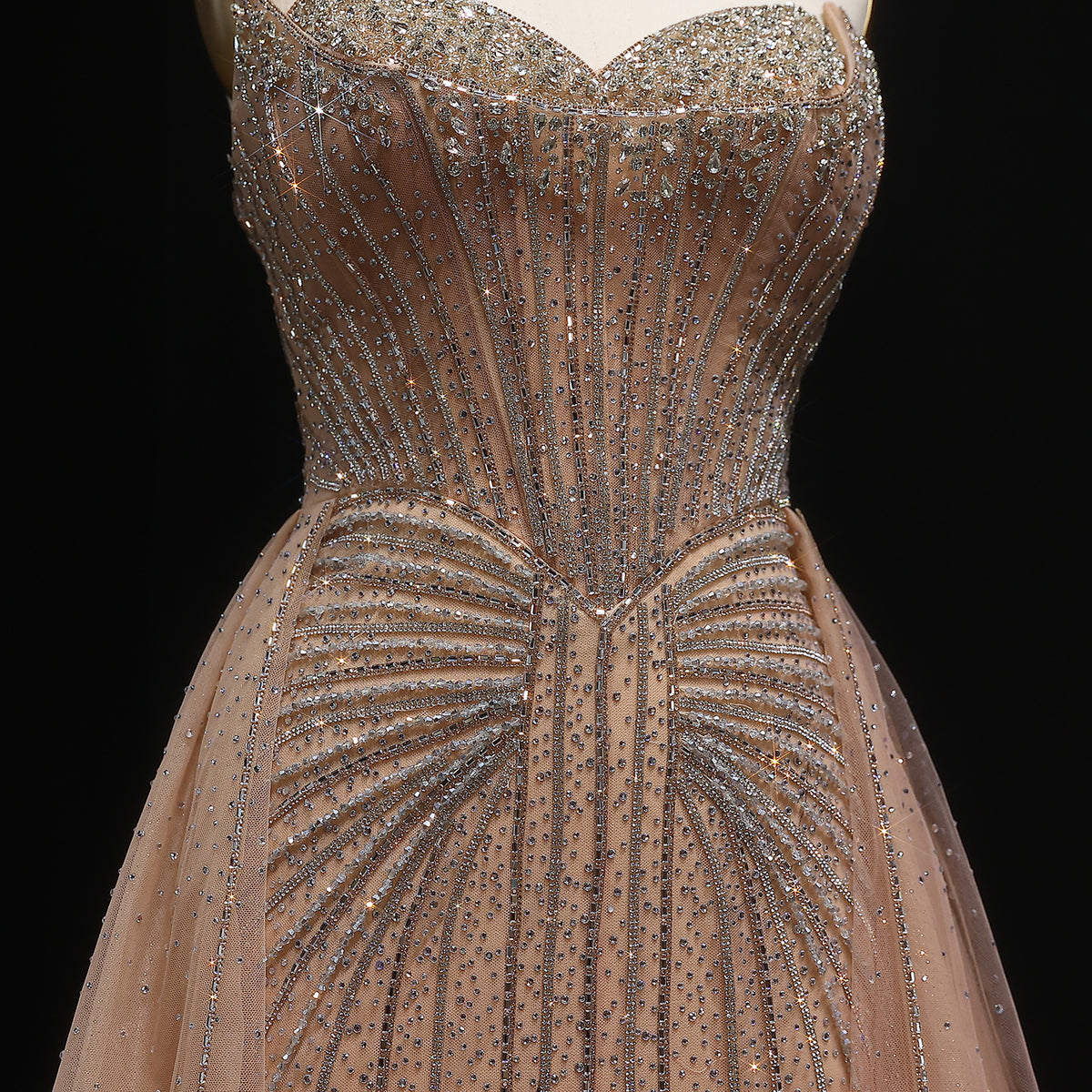 Elevate your evening look with our Luxury Beaded Champagne Evening Dress with Overskirt SS360. This exquisite dress features intricate beading and an elegant overskirt, creating a stunning silhouette. Made with luxurious materials, it is perfect for any formal occasion.