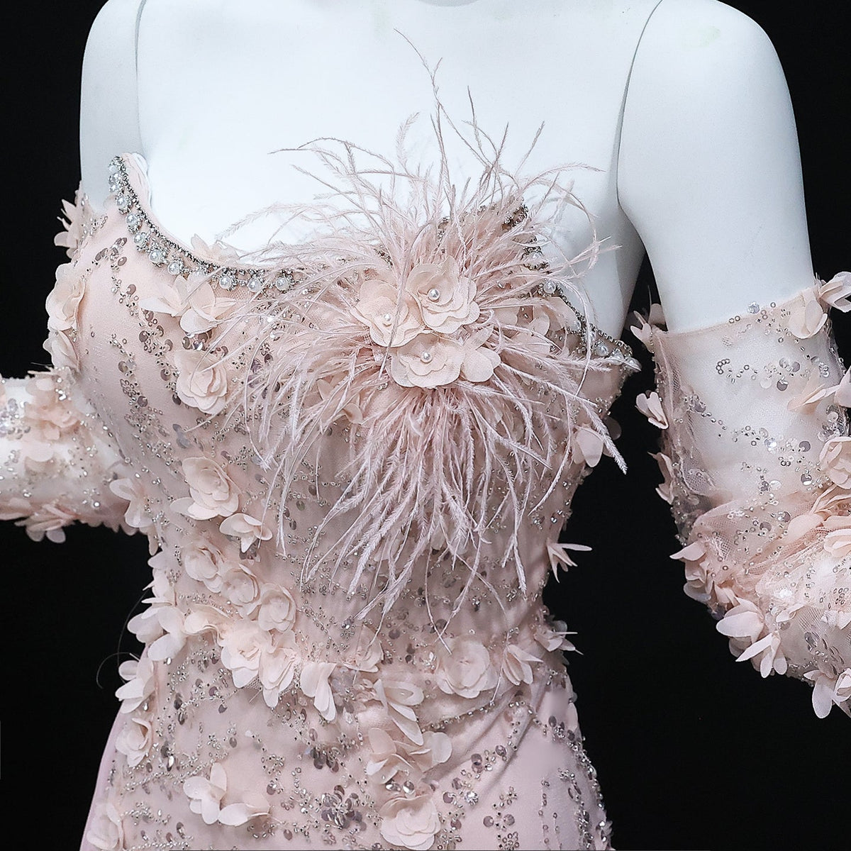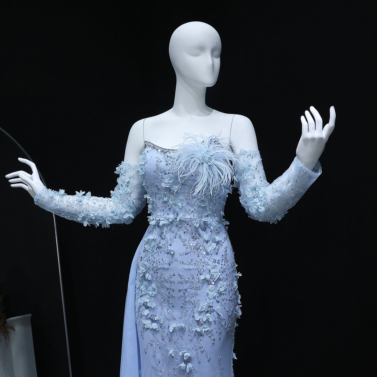 Expertly designed for any special occasion, this Mermaid Evening Dress is adorned with 3D flowers and delicate feathers. The elegant blue hue adds a touch of sophistication, while the sleeves provide coverage and comfort. Perfect for weddings, parties, or any formal event.