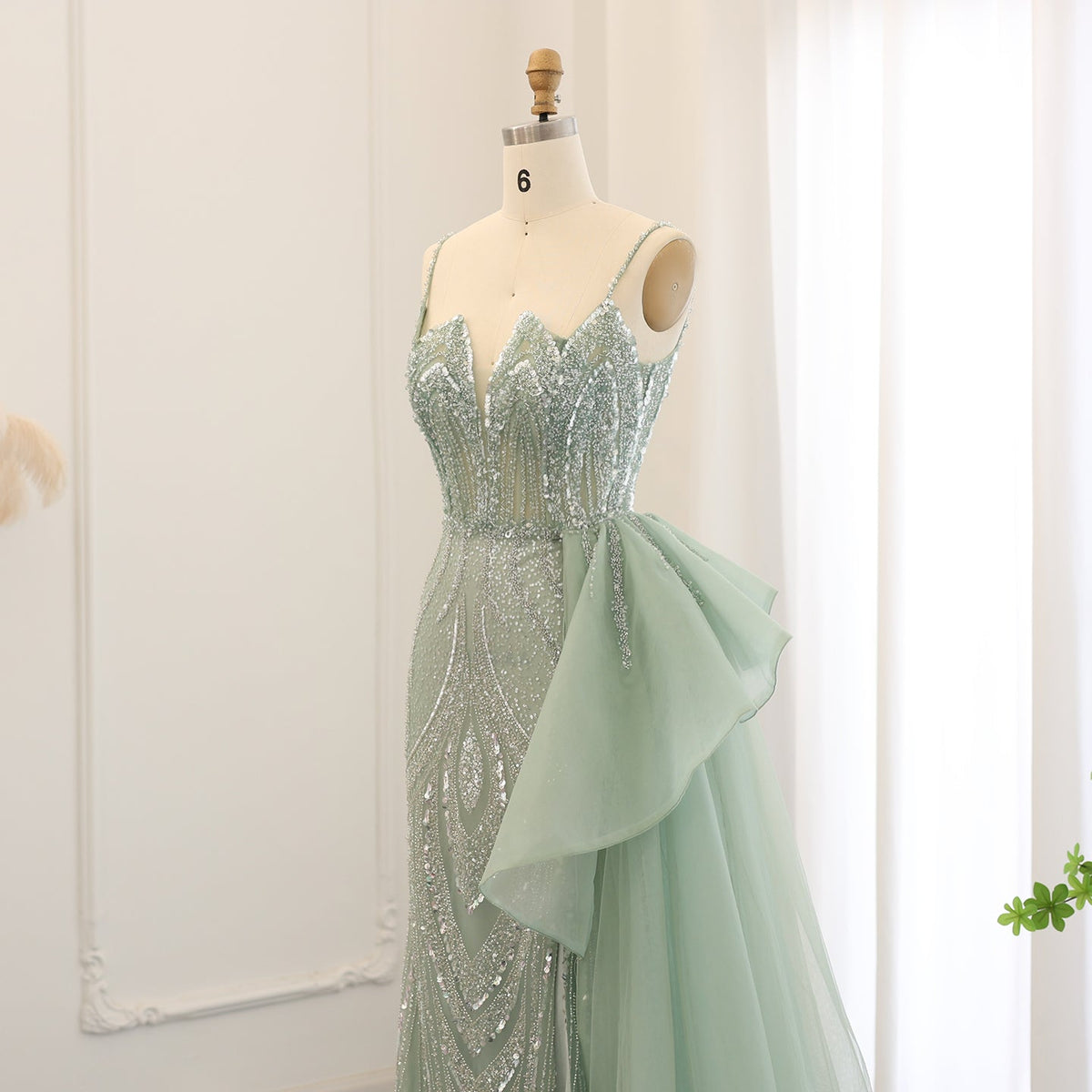 Elegant Crystal Sage Green Evening Dress with Overskirt SS039