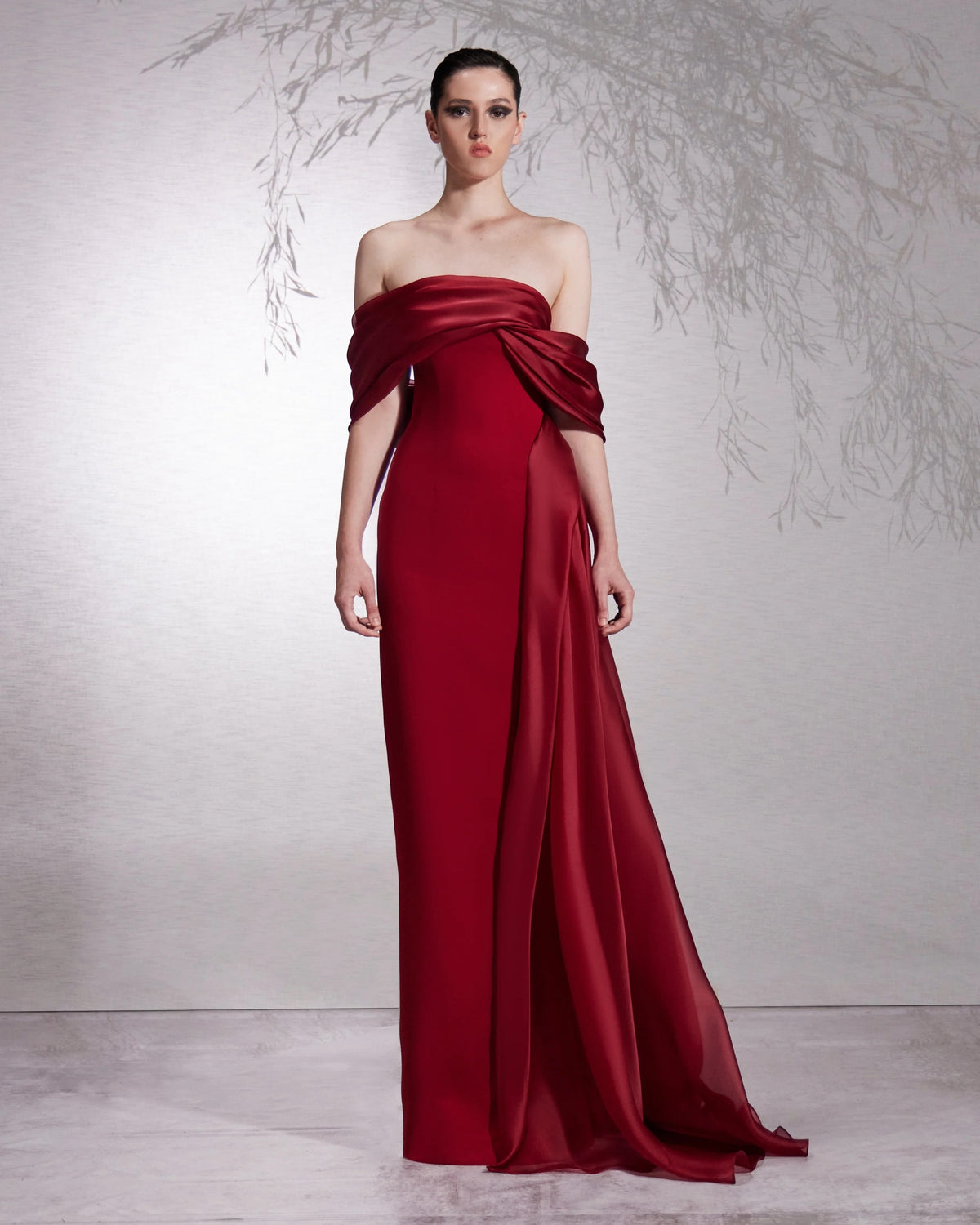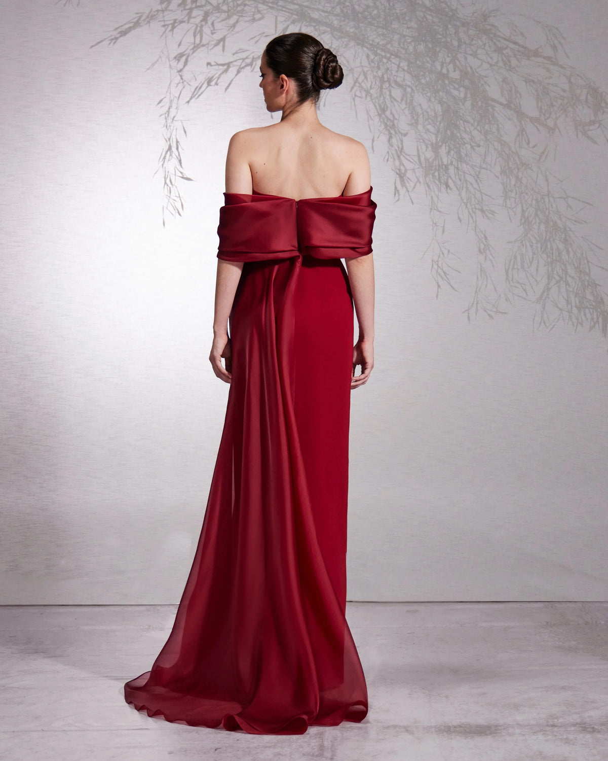 This stunning evening dress features an elegant off shoulder design and a flowing overskirt, creating a sophisticated and timeless look. The soft pink color adds a touch of femininity to the dress, making it perfect for any special occasion. Elevate your style with this beautifully crafted dress.