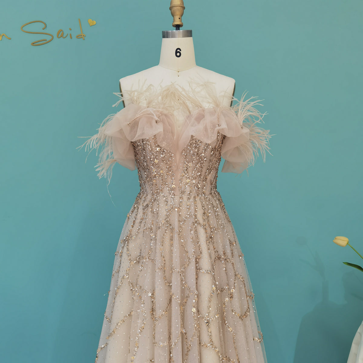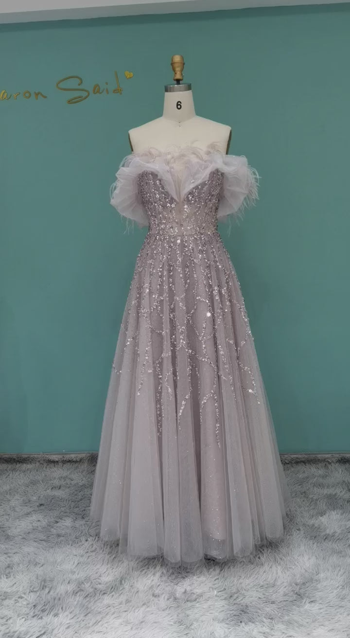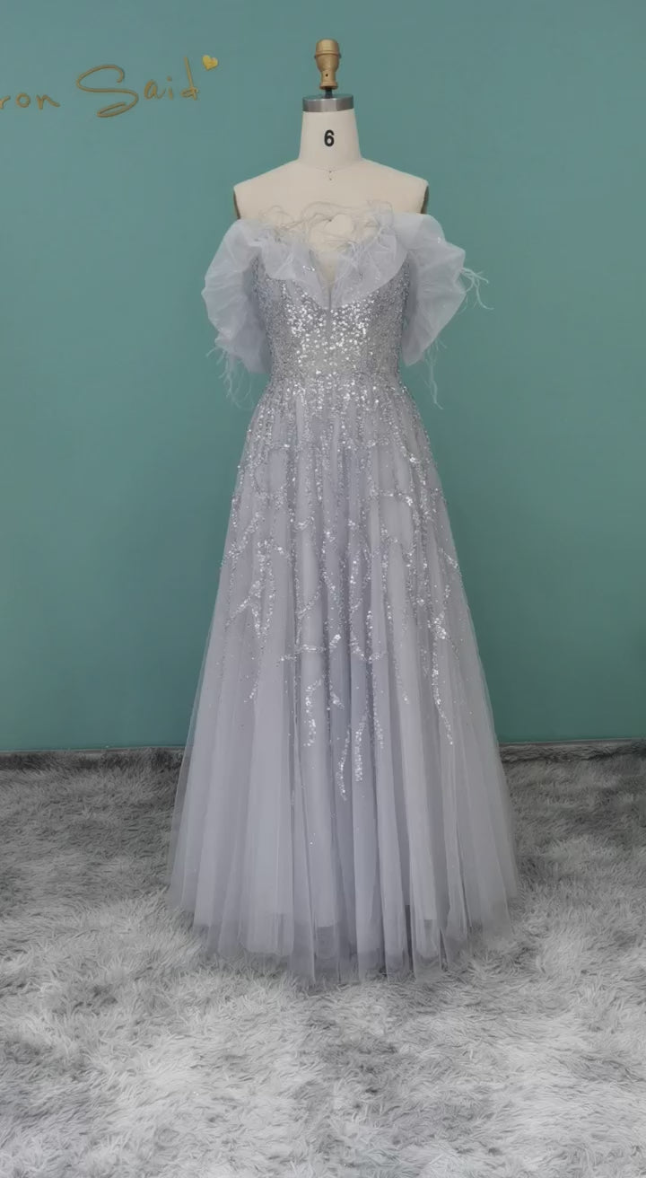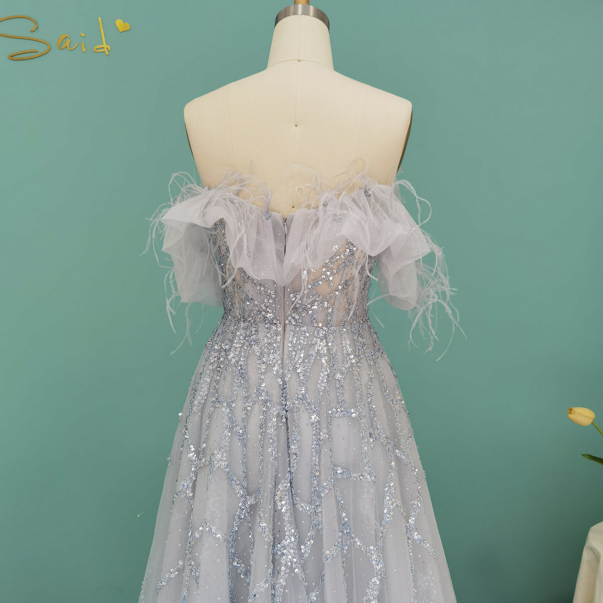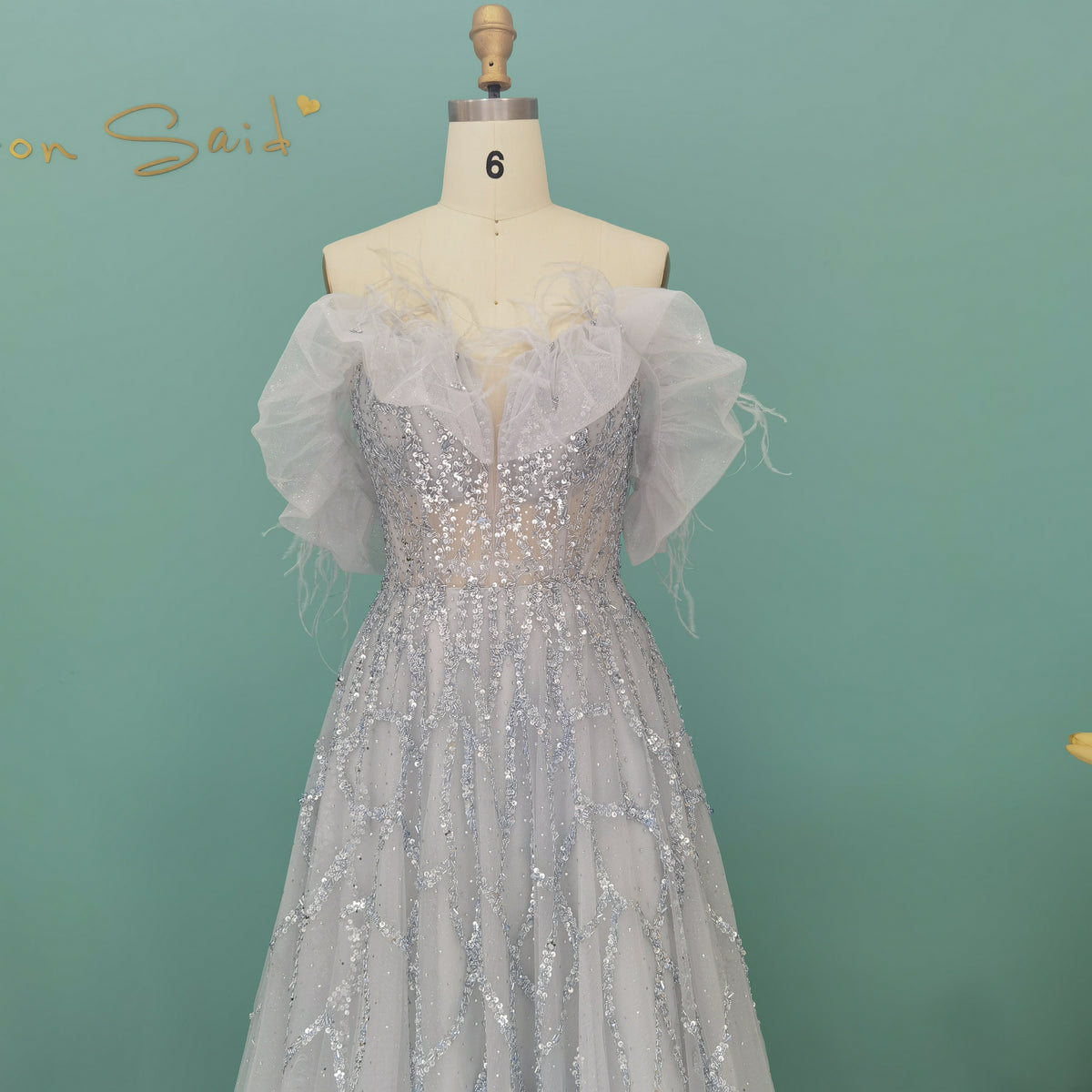 Luxury Feather Silver Beaded A-Line Evening Dress SS081