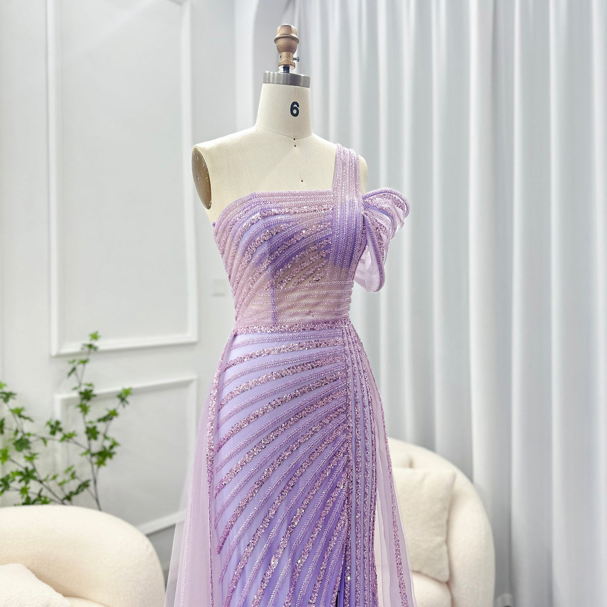 Elevate your evening look with the Sharon Said Luxury Dubai Sage Green Evening Dress. This gorgeous gown features an elegant one shoulder design and a striking overskirt with a side slit in a complementary lilac color. Perfect for weddings, formal parties, and more, this dress exudes luxury and sophistication.