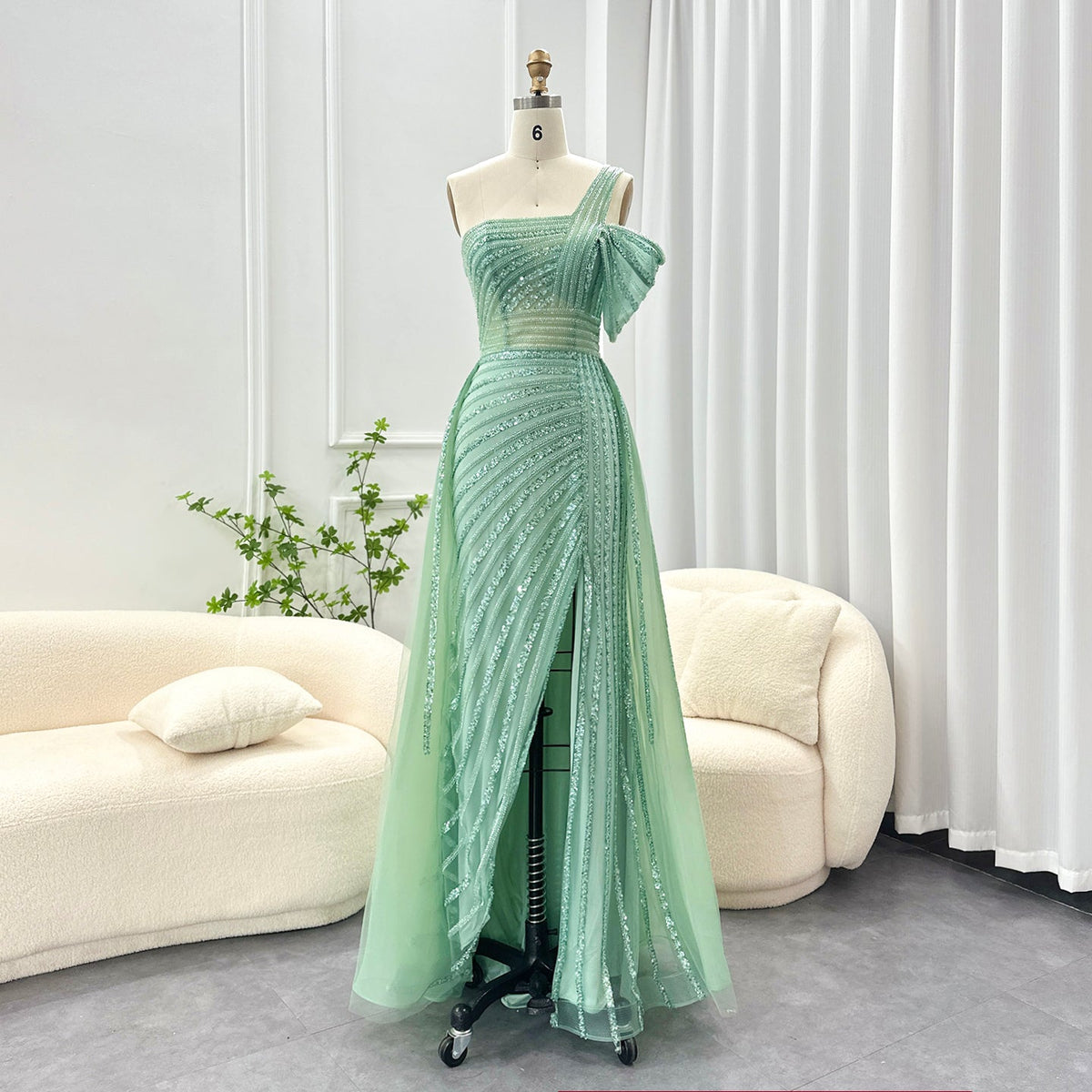 Luxury Sage Green One Shoulder Evening Dress with Overskirt SS016