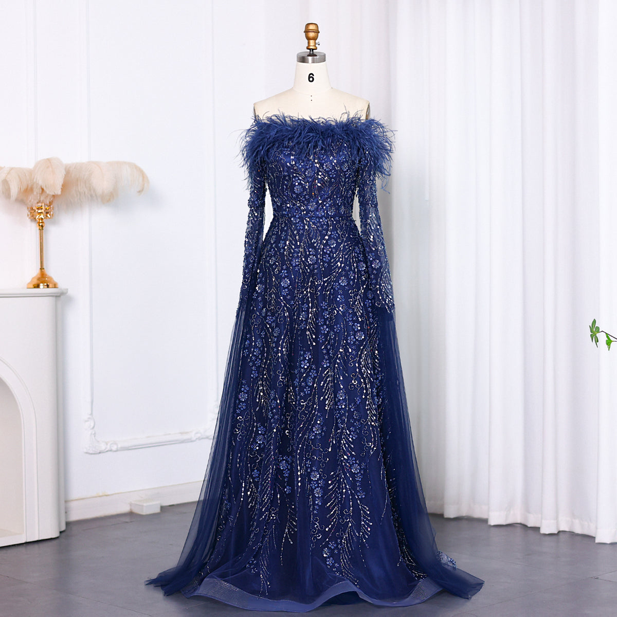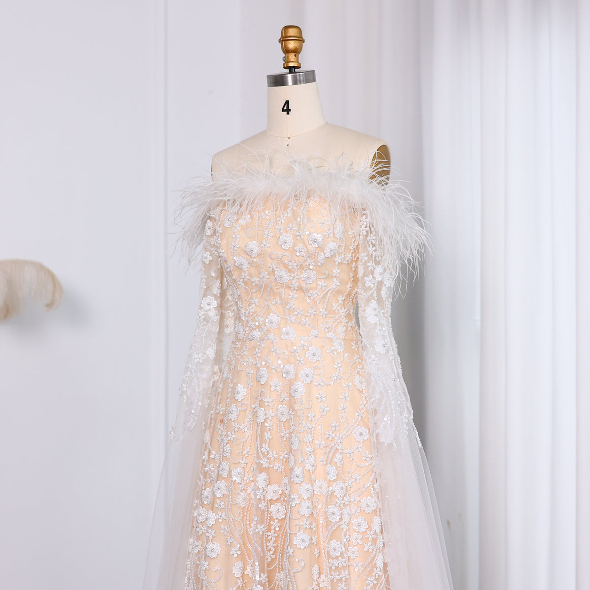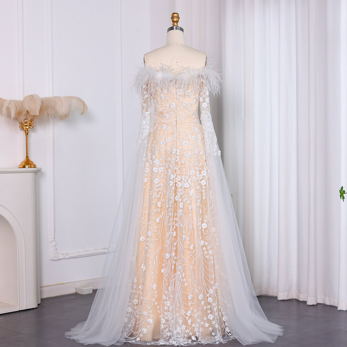 Show off your unique style with our Off Shoulder Feathers Brown Evening Dress! The elegant cape sleeves and feather details create a show-stopping look that will make you stand out at any event. Look and feel confident while turning heads in this stunning dress.