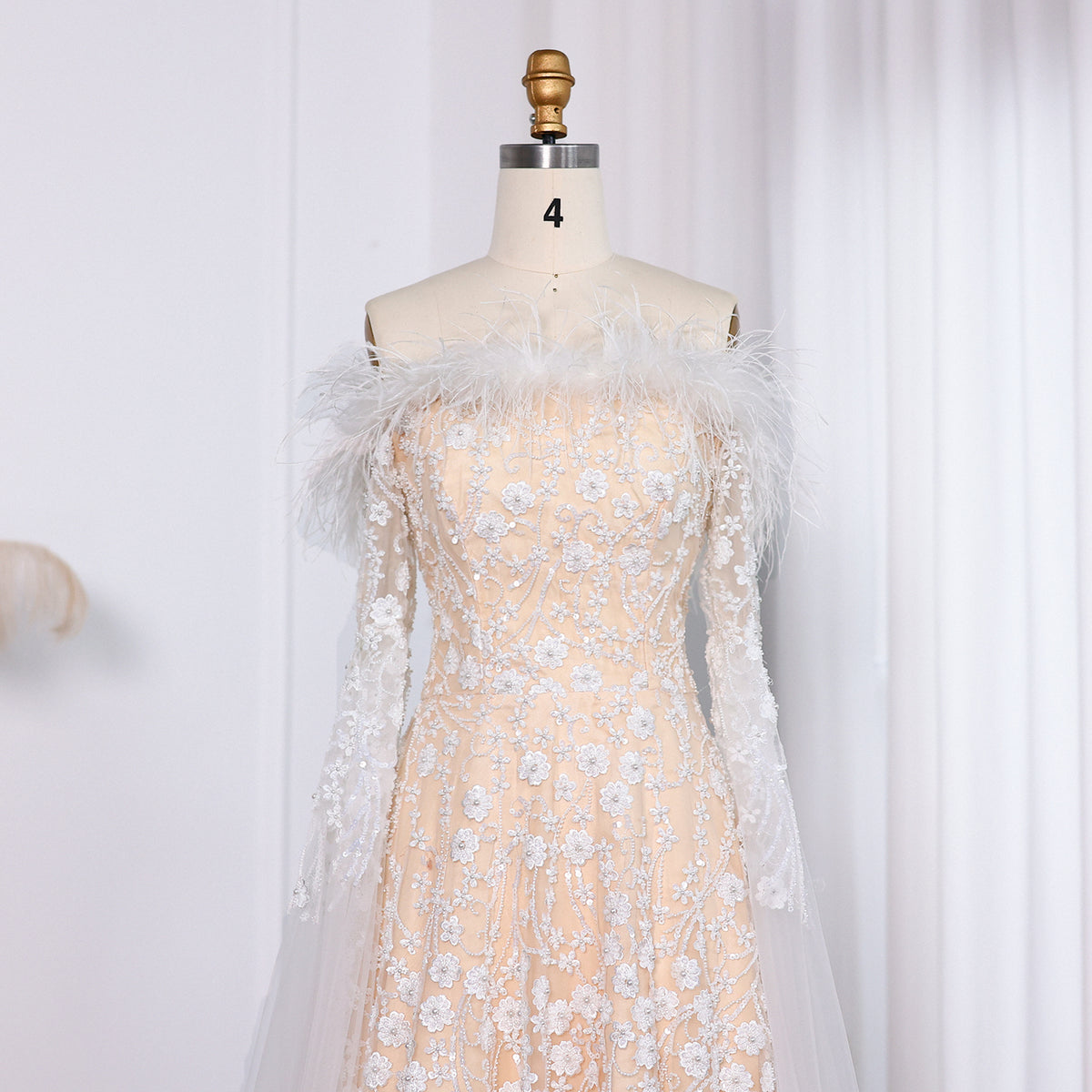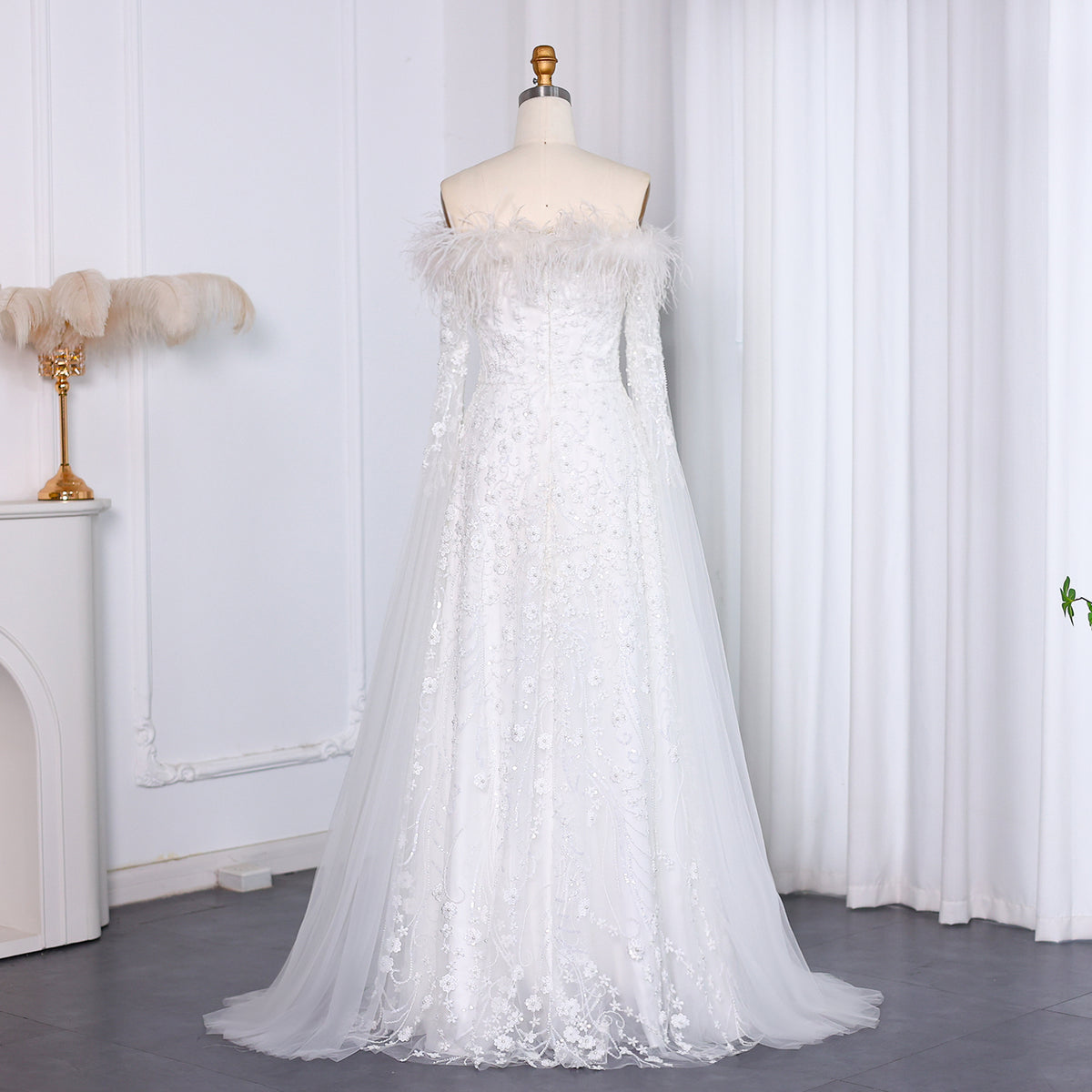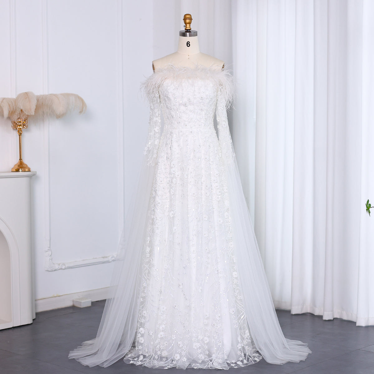 Show off your unique style with our Off Shoulder Feathers Brown Evening Dress! The elegant cape sleeves and feather details create a show-stopping look that will make you stand out at any event. Look and feel confident while turning heads in this stunning dress.