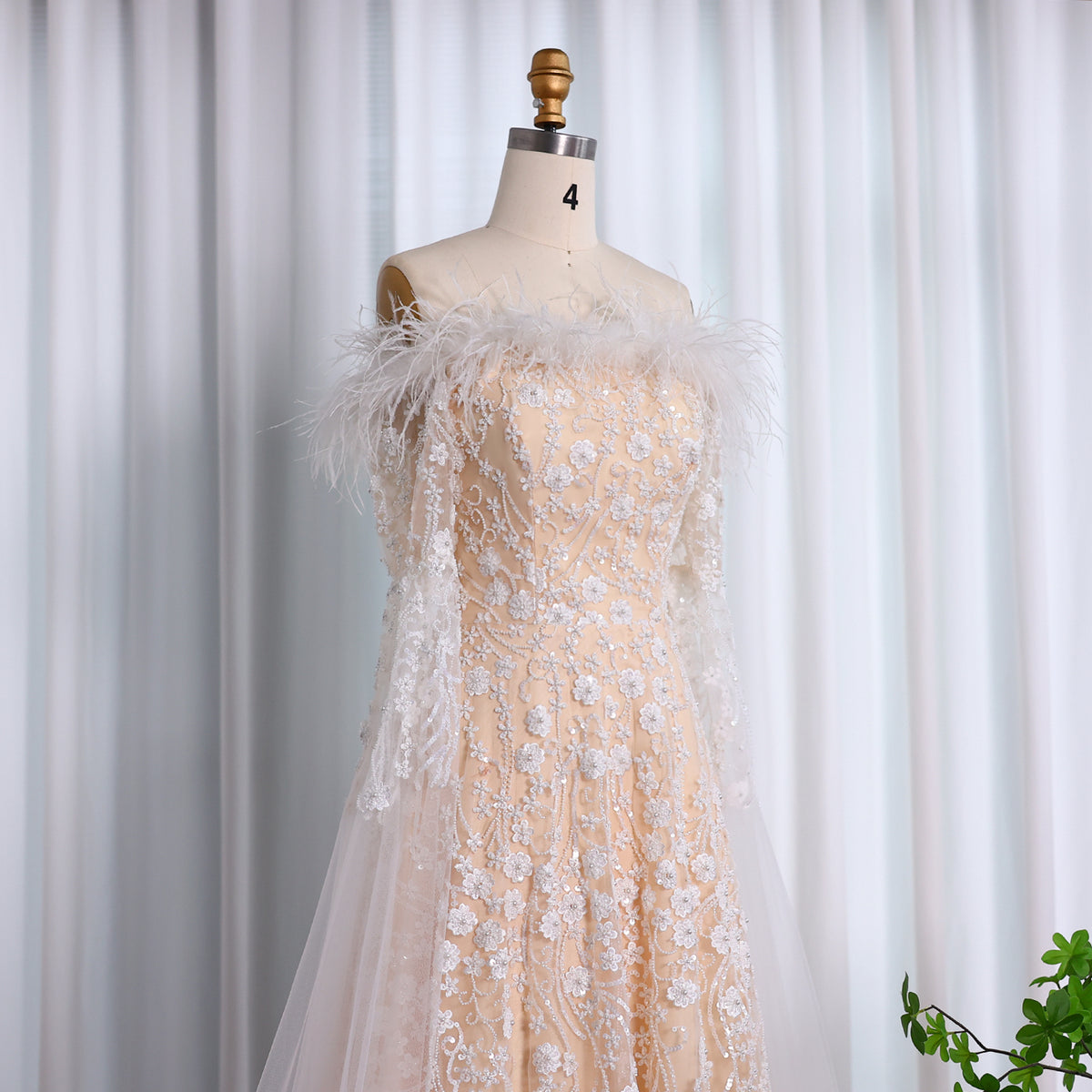 Off Shoulder Feathers Brown Evening Dress with Cape Sleeves SS707