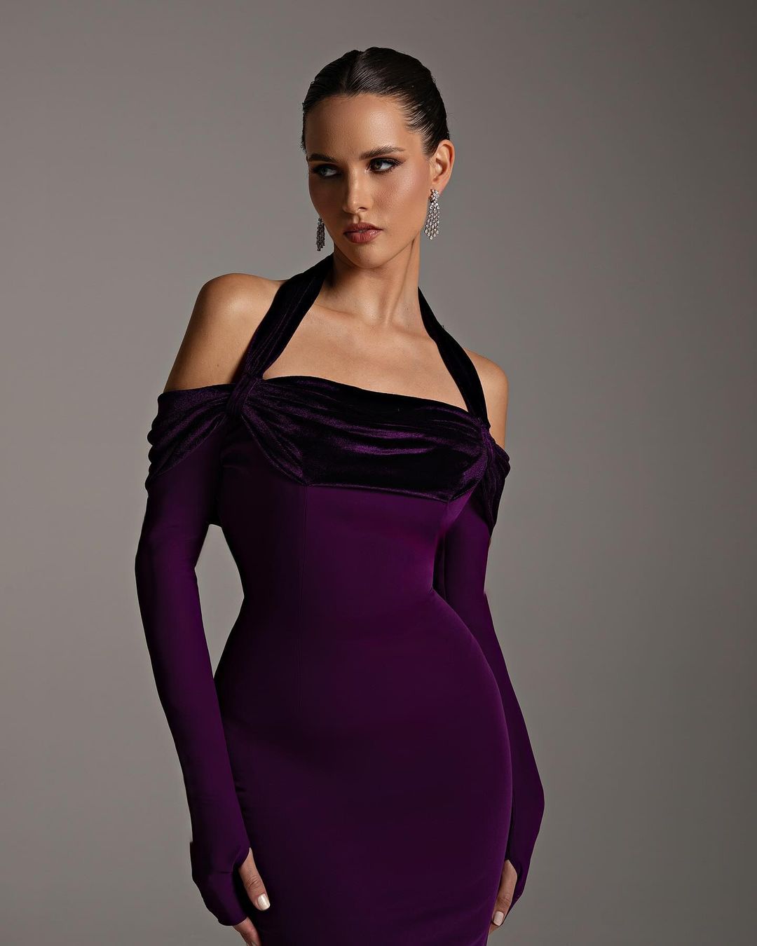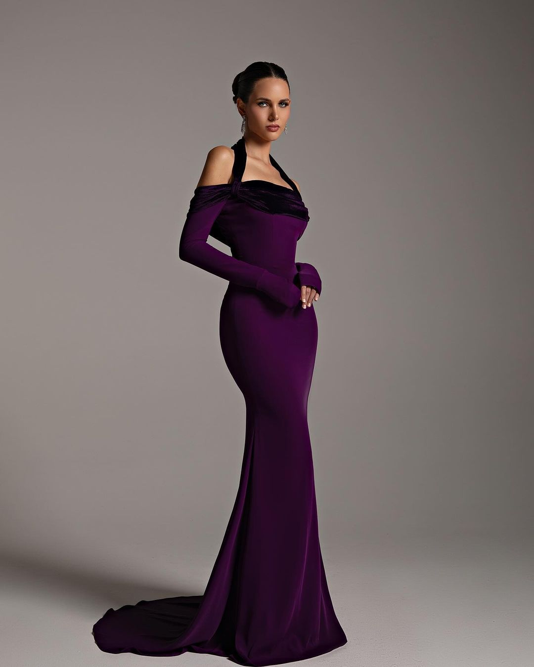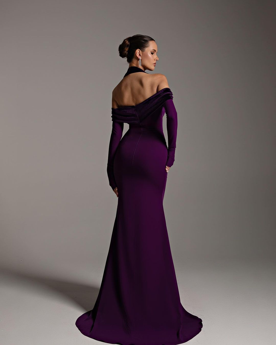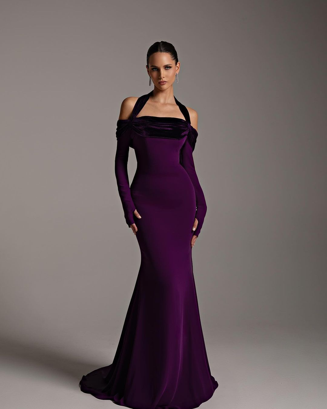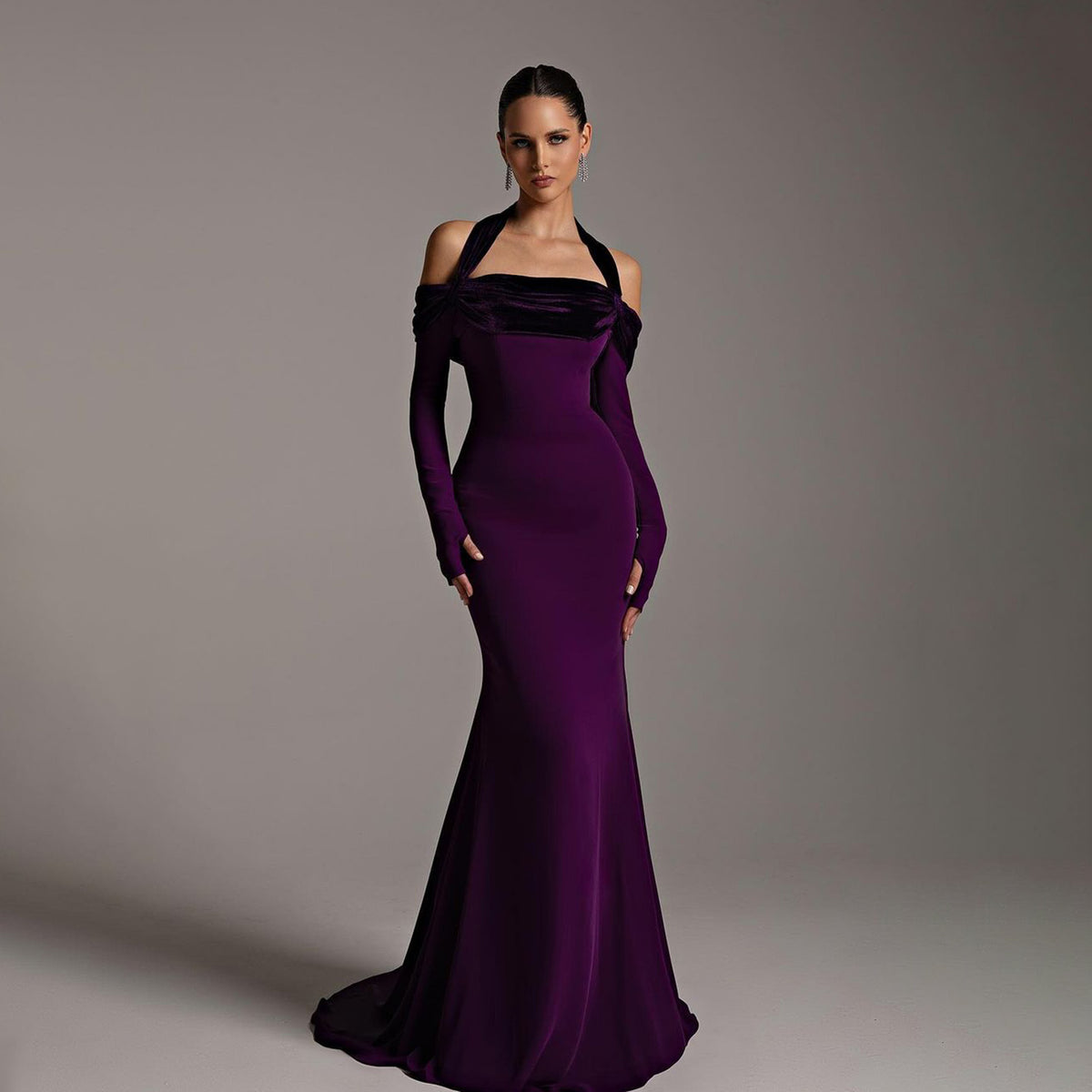 This elegant halter dress features long sleeves and a flattering mermaid silhouette. With its deep purple hue, it exudes sophistication and style. Perfect for evening events, it will make you stand out with its stunning design. Made with high-quality materials, it offers both comfort and style.