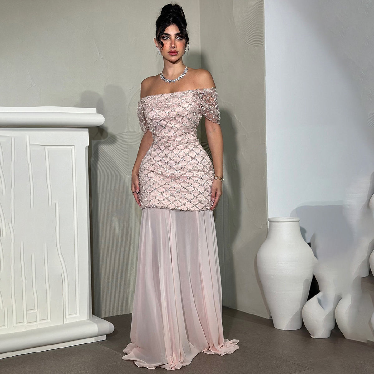Elegant Pearls Pink Off-Shoulder Evening Dress SF305