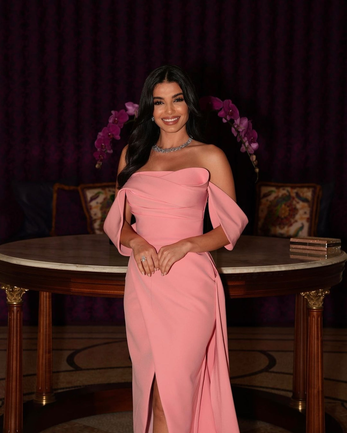 Elegant Pink Off-Shoulder Evening Dress with Overskirt SF325