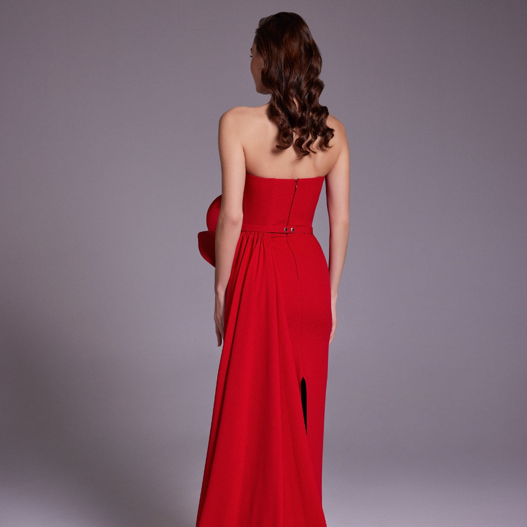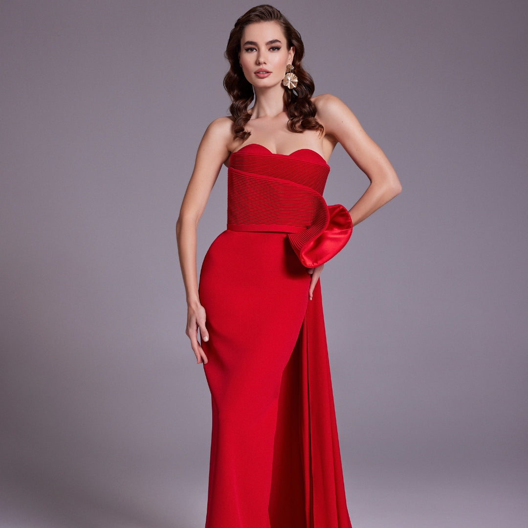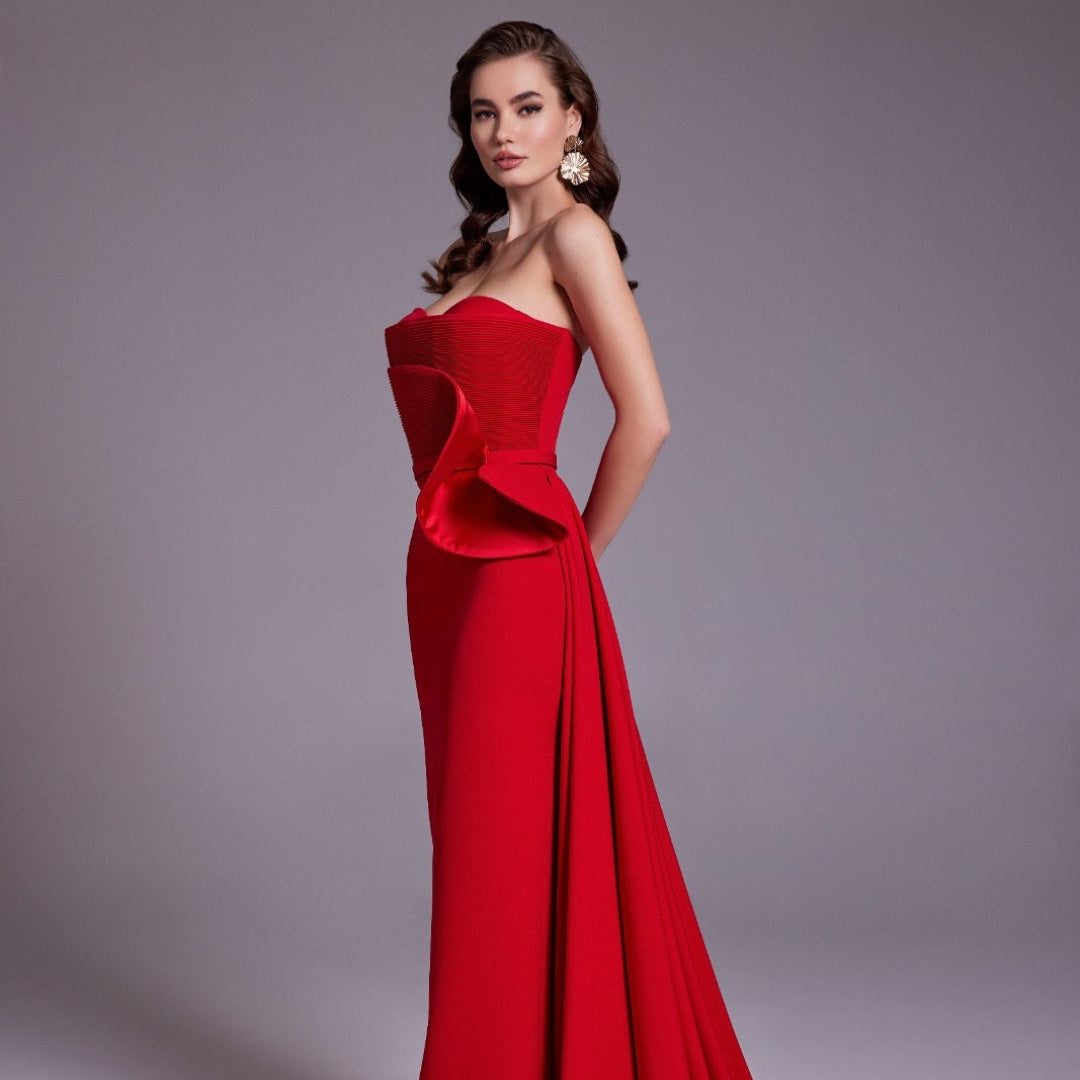 Elegant Red Pleats Satin Evening Dress with Overskirt SF331