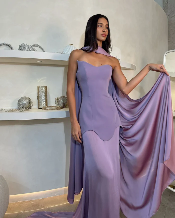 This elegant evening dress features a strapless lilac scarf detail and a stunning train, creating a timeless and sophisticated look. The dress is perfect for formal events, weddings, or any special occasion, and will make you stand out with its beautiful design. Made with high-quality materials, this dress exudes luxury and elegance. Elevate your style with this stunning piece.