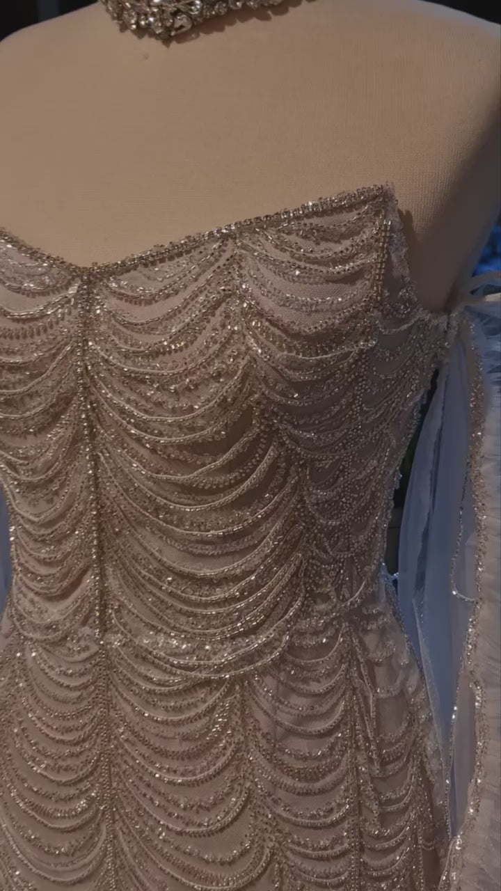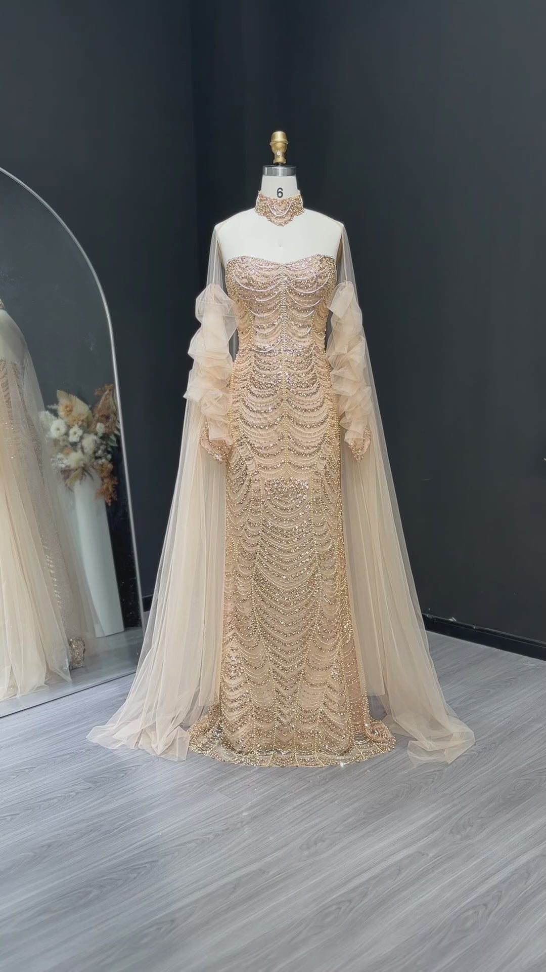 Luxury Beaded Champagne Evening Dress with Cape Sleeve SS535